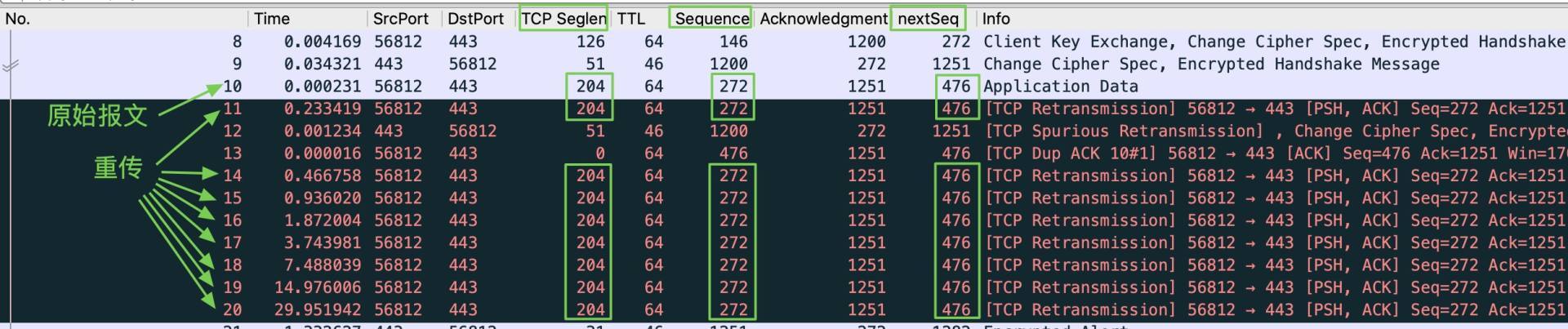 我们重点关注下第三阶段,也就是11~20号报文这些重传。那么问题来了:这些重传都是重传了谁呢?也就是如何找到原始报文呢?