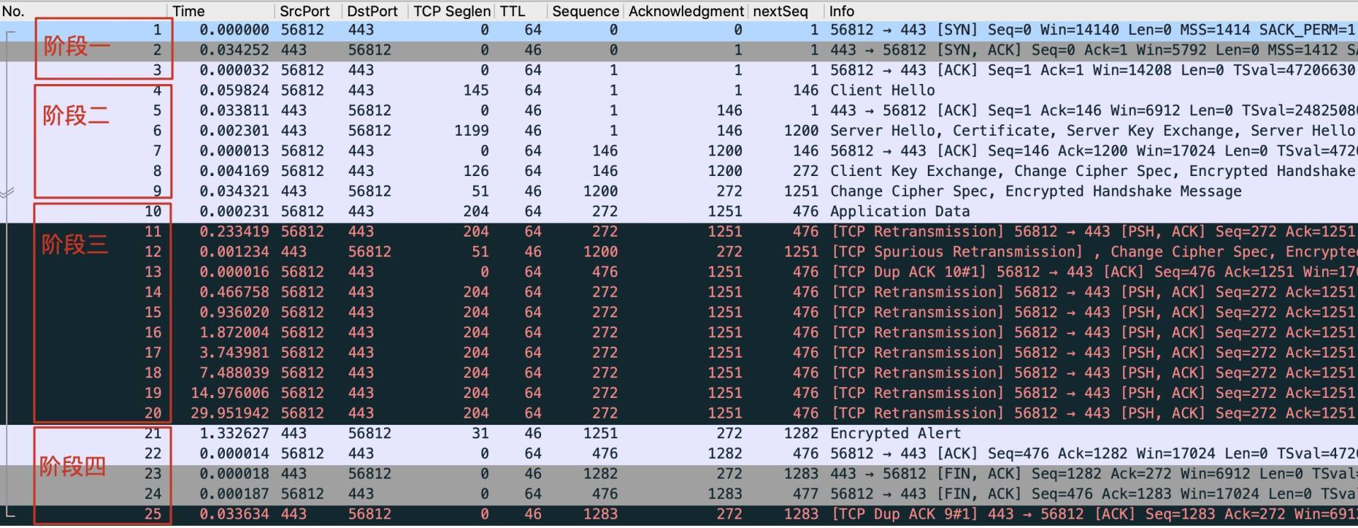 - 第三阶段:11~20号报文是连续重传,以及夹杂的DupAck和Spurious重传。
