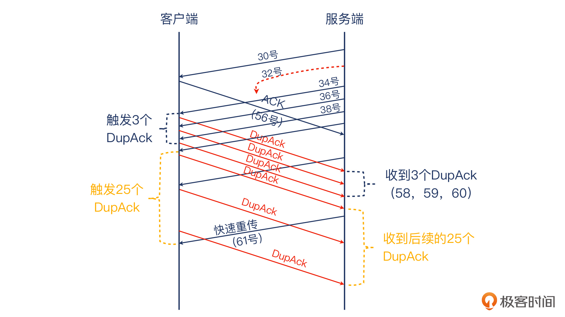 我直接给你揭晓答案:就是因为从32号报文之后,服务端还继续发送了14个数据报文,远不止3个,所以触发的DupAck也远不止是3个。你可以直接看下图来理解这里的逻辑: