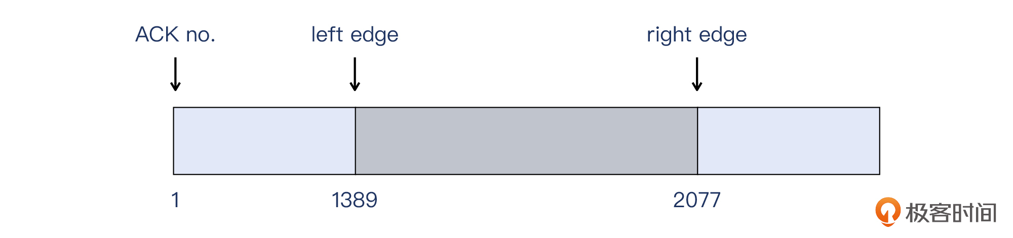 SACK最关键的部分就是 left edge和 right edge,也就是左右边界。上图告诉我们:我收到了从第1389字节开始直到2076字节(也就是不含2077)的数据。这样,我们可以把SACK和确认号结合起来,知道了通过这个报文,接收端(这里是客户端)明白了什么样的信息。我用示意图把这个信息表示了出来: