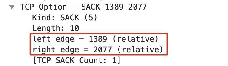 你可以直接进入关键部分,也就是这里框出来的TCP Option SACK 1389-2077。SACK全称是Selective Acknowlegement,中文叫“选择性确认”。但是在中文里,貌似带“选择性”这个前缀的词都不是很正面,比如像“选择性忽视”“选择性失忆”什么的,我们好像都不想摊上这种事。