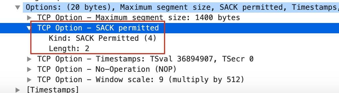 既然SACK这么好,是不是TCP传输都能用上它呢?其实,SACK要能工作,还需要SACK permitted这个TCP扩展属性的支持。这个字段只有在TCP握手的SYN和SYN+ACK报文中出现,表示自己是否支持SACK特性。比如下图: