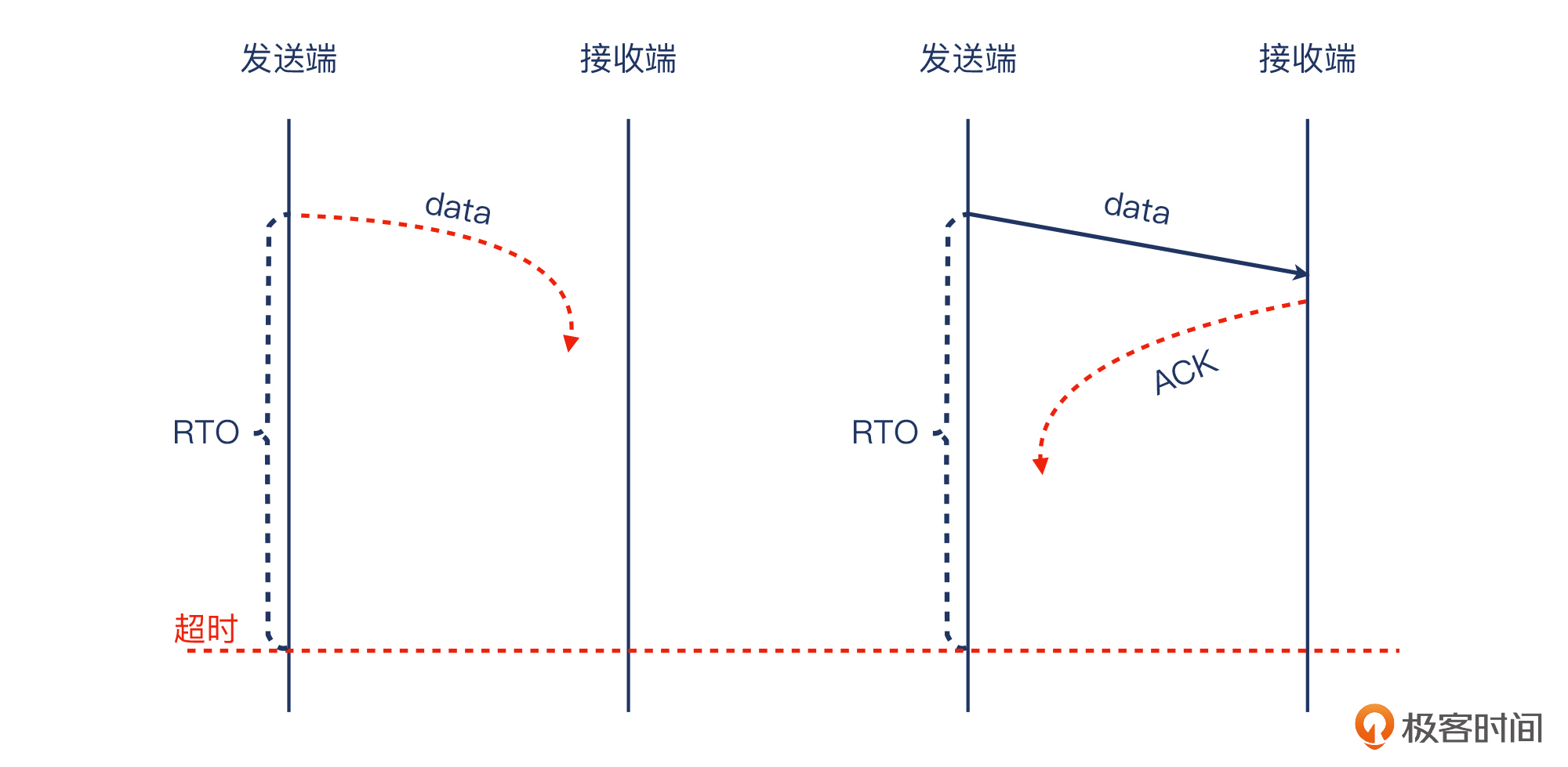 我们先来学习下超时重传,Timeout Retransmission。在TCP传输中,以下两种情况,都可能会导致发送方收不到确认: