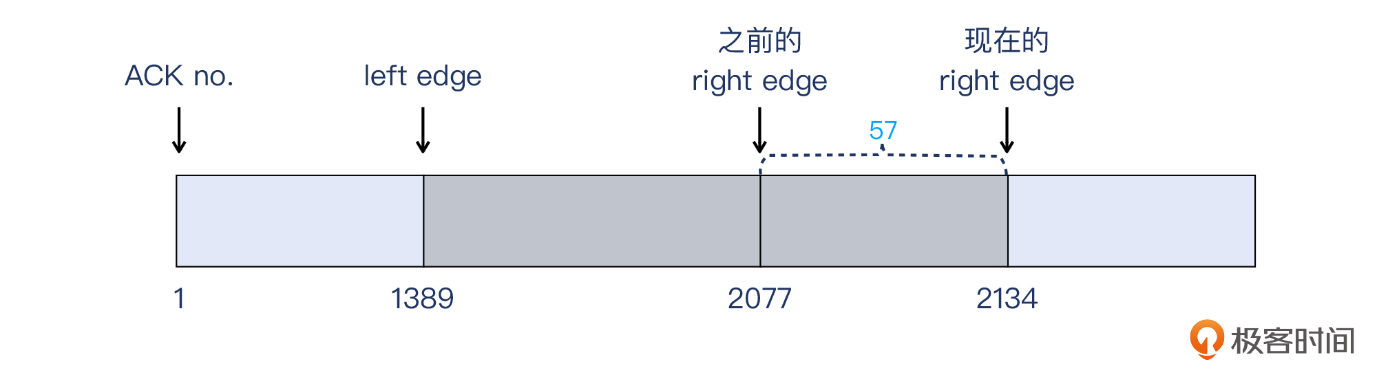 可见,第二个重复确认报文的SACK,把实际收到的报文边界又往右“推”了一些,到了第2134字节(之前是第2077字节)。这个差额是2134-2077=57。