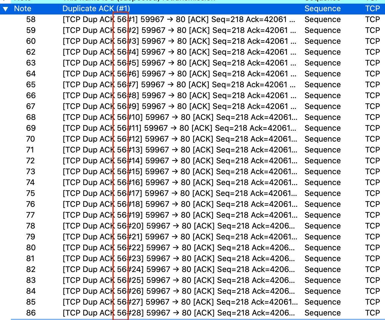 - Duplicate ACK (#1):这里有28个重复确认报文,而且,如果我们点开的话,会发现这28个DupAck指向的都是同一个报文:56号报文。