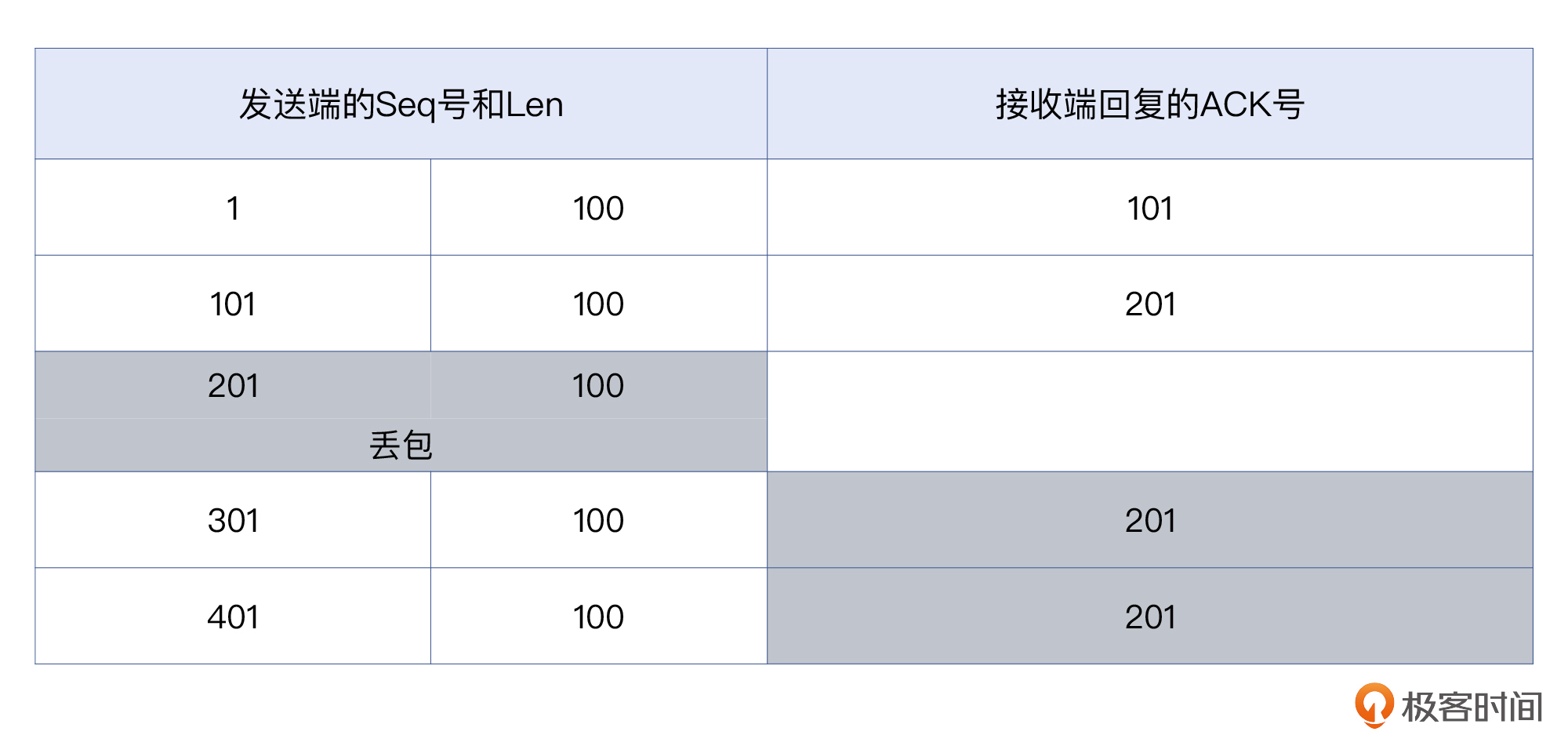 接收端回复的报文的确认号,只能是连续字节数的最后一个位置。因为发送端的序列号为201、长度为100的TCP报文丢失了,那么服务端收到的连续字节数的最后一个位置,就是第201字节。这还不是最糟糕的,后续发送过来的序列号为301和401这两个报文,服务端回复的确认报文的确认号也仍然只能是201。