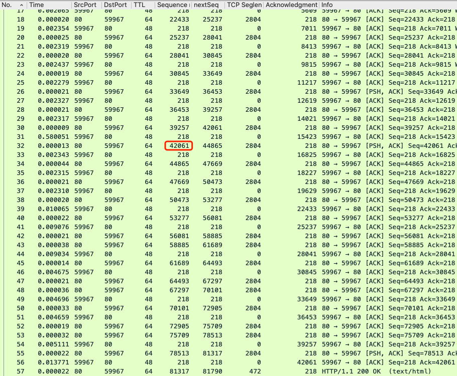 61号快速重传报文的原始报文是哪个呢?不难找到,它就是32号报文,因为它的序列号就是42061,也就是连续DupAck的确认号。