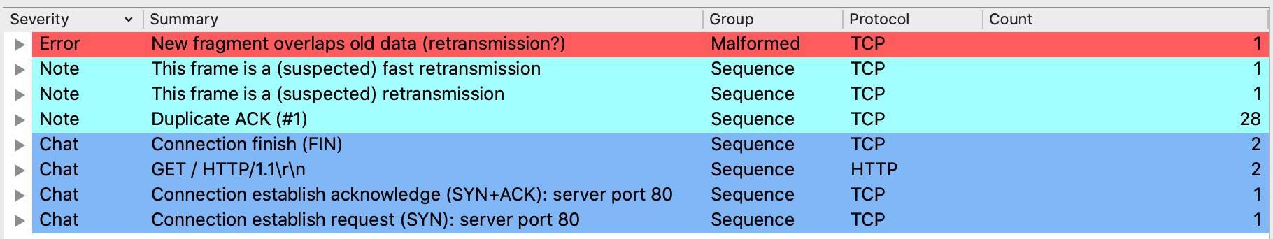 - 如果在专家信息里看到 New fragment overlaps old data (retransmission?),这意味着多个报文之间的数据有重叠,但一般不是严重的问题。
