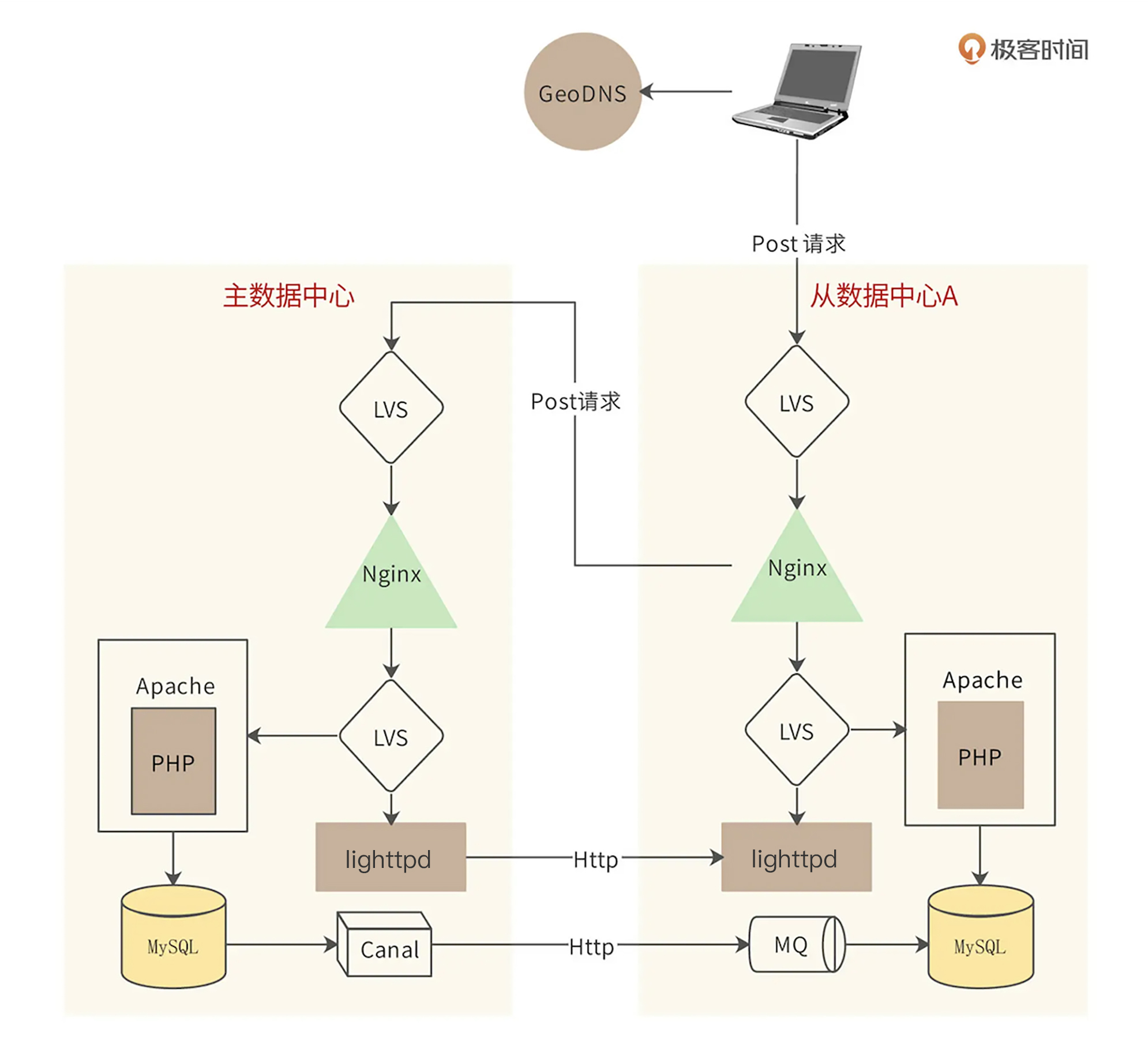 Wepedia的多数据中心架构为一主多从架构,即一个主数据中心,多个从数据中心。如果用户请求是Get请求(读请求),那么请求就会在该数据中心处理。如果请求是Post请求(写请求),那么请求到达Nginx的时候,Nginx会判断自己是否为主数据中心,如果是,就直接在该数据中心处理请求;如果不是,Nginx会将该Post请求转发给主数据中心。