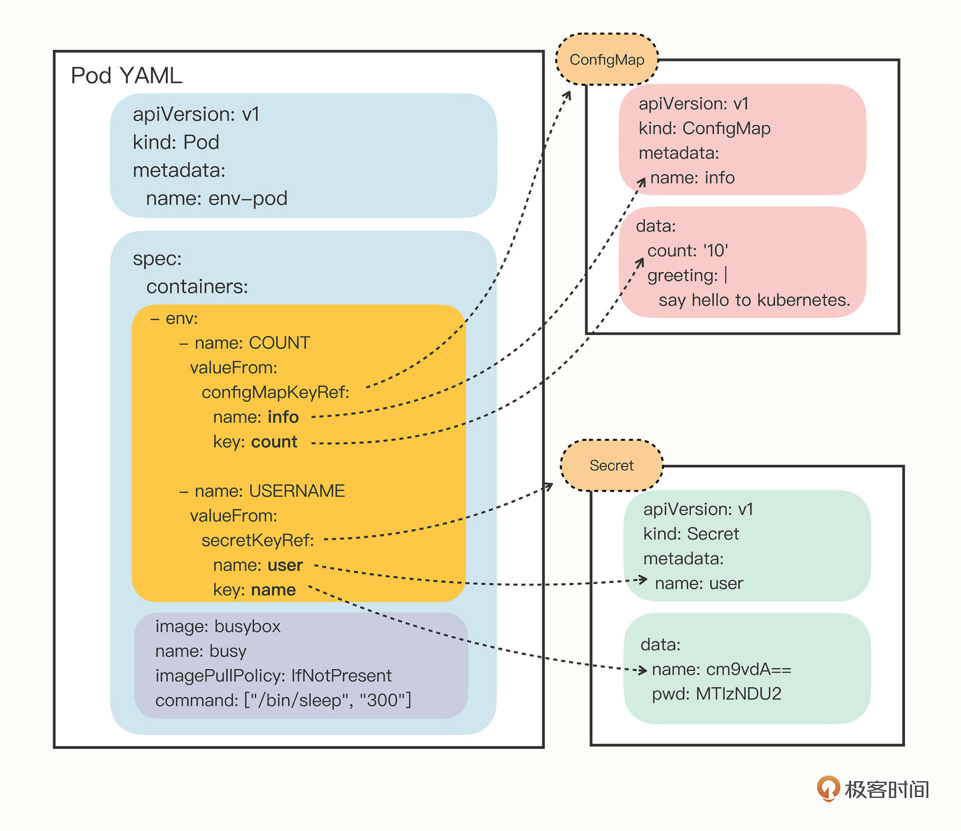 当时我们只使用了简单的“value”,把环境变量的值写“死”在了YAML里,实际上它还可以使用另一个“valueFrom”字段,从ConfigMap或者Secret对象里获取值,这样就实现了把配置信息以环境变量的形式注入进Pod,也就是配置与应用的解耦。