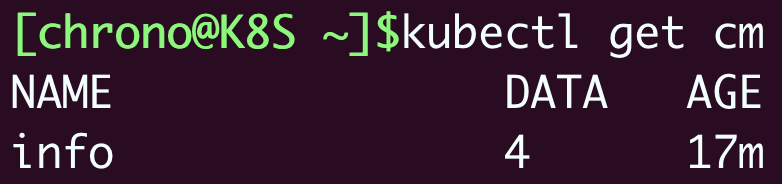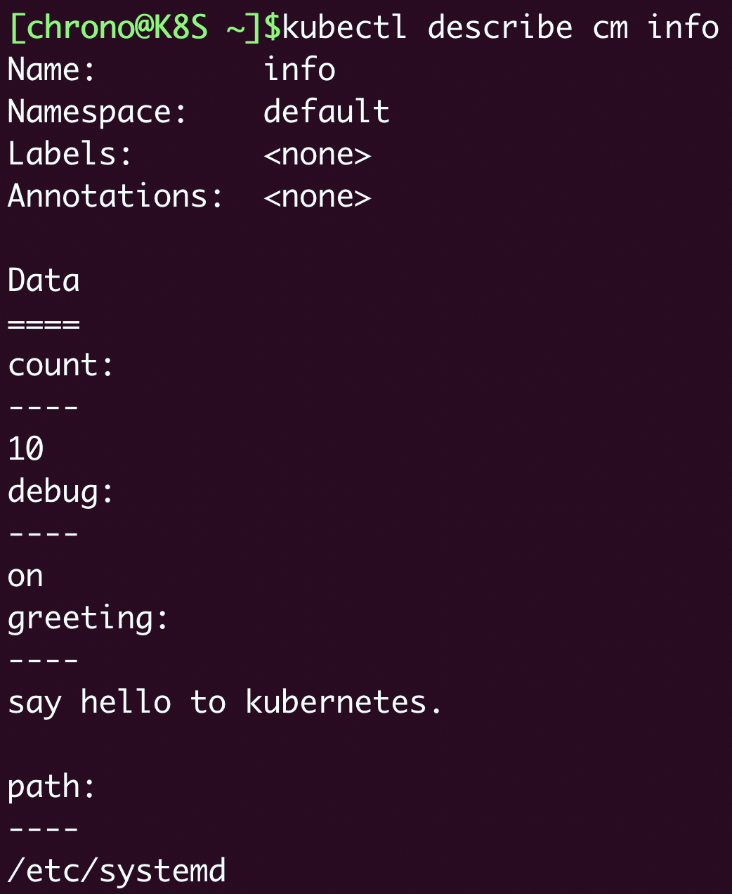 创建成功后,我们还是可以用 kubectl get、kubectl describe 来查看ConfigMap的状态:
