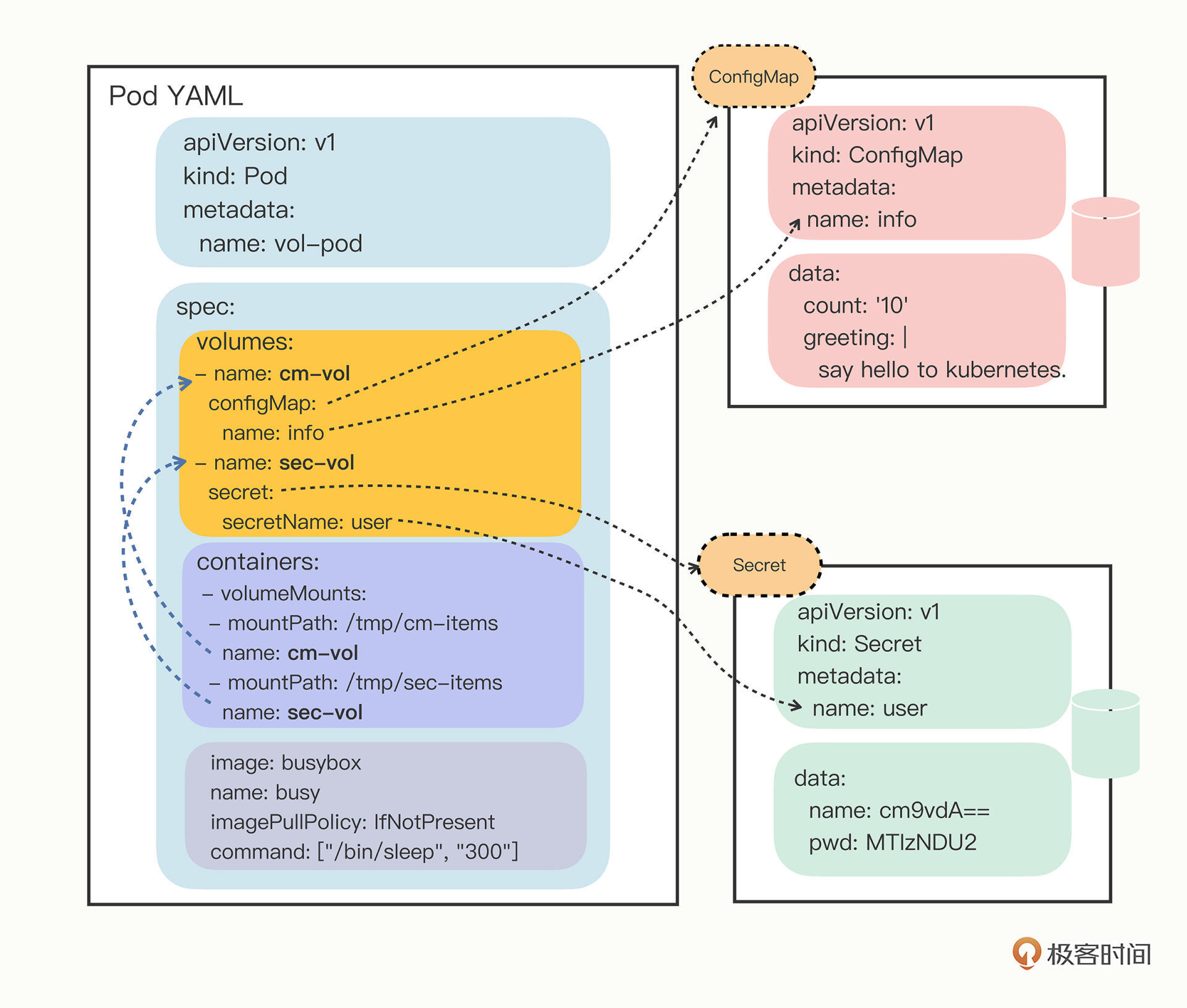 这段解释确实是有点绕口令的感觉,因为ConfigMap和Secret在Pod里的组合关系不像Job/CronJob那么简单直接,所以我还是用画图来表示它们的引用关系: