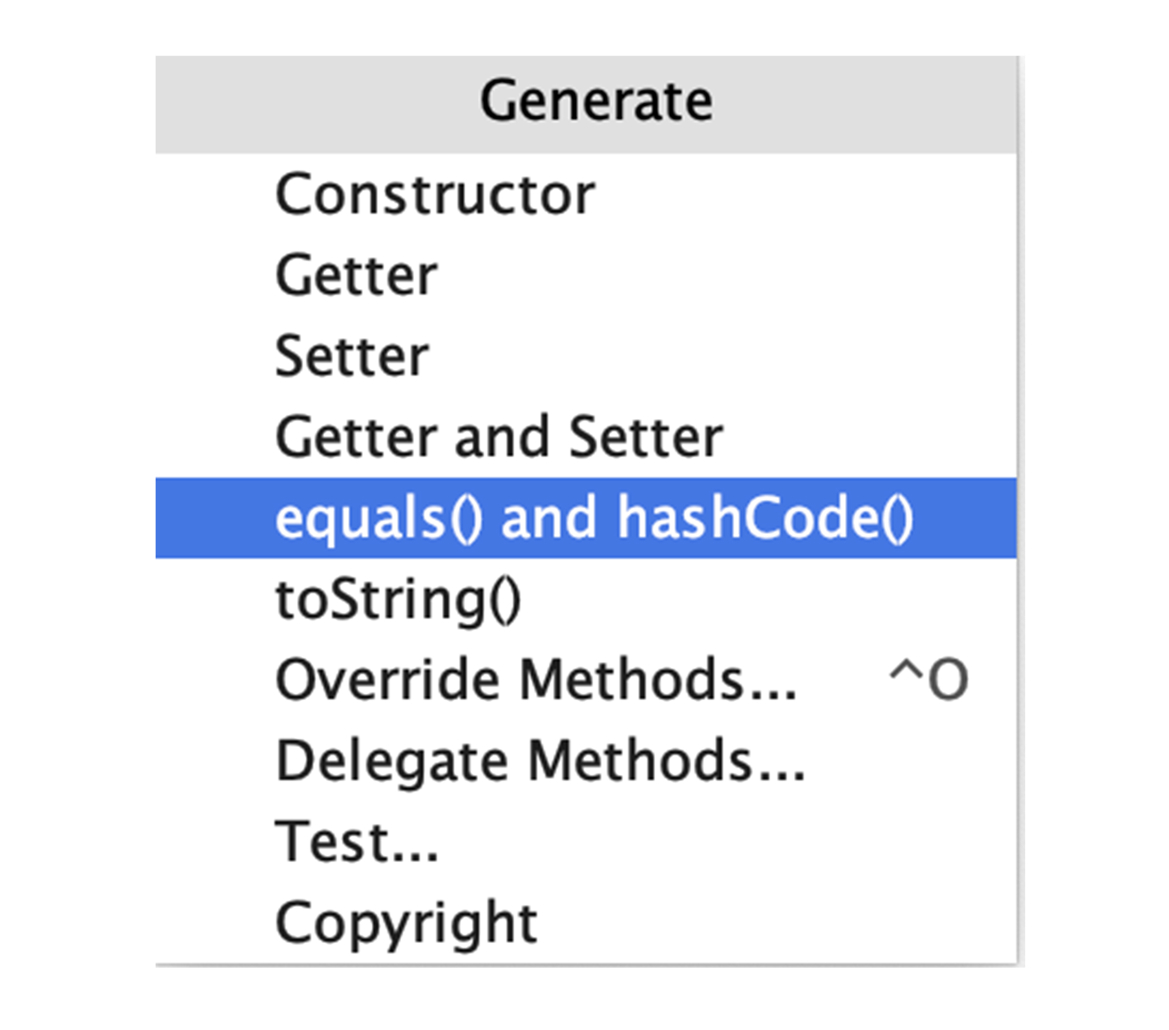 看到这里,你可能会觉得自己实现equals和hashCode很麻烦,实现equals有很多注意点而且代码量很大。不过,实现这两个方法也有简单的方式,一是后面要讲到的Lombok方法,二是使用IDE的代码生成功能。IDEA的类代码快捷生成菜单支持的功能如下: