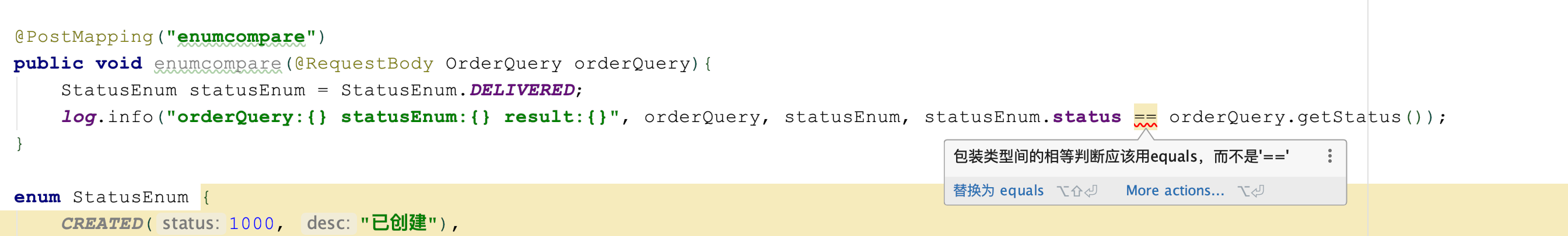 在业务代码中,开发同学使用了==对枚举和入参OrderQuery中的status属性进行判等:
