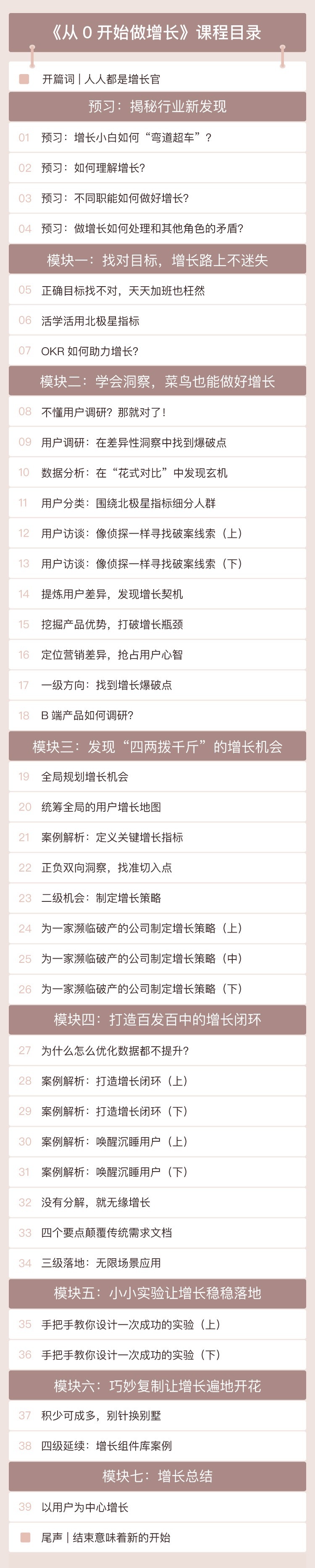 总共7个部分,每个部分都有“发现→对比→分析→总结”这个过程,第一部分的“总结”就是第二部分的“发现”,每个部分都前后衔接、环环相扣,最终手把手带你了解整个增长路径,让你在不知不觉中获得认知升级。