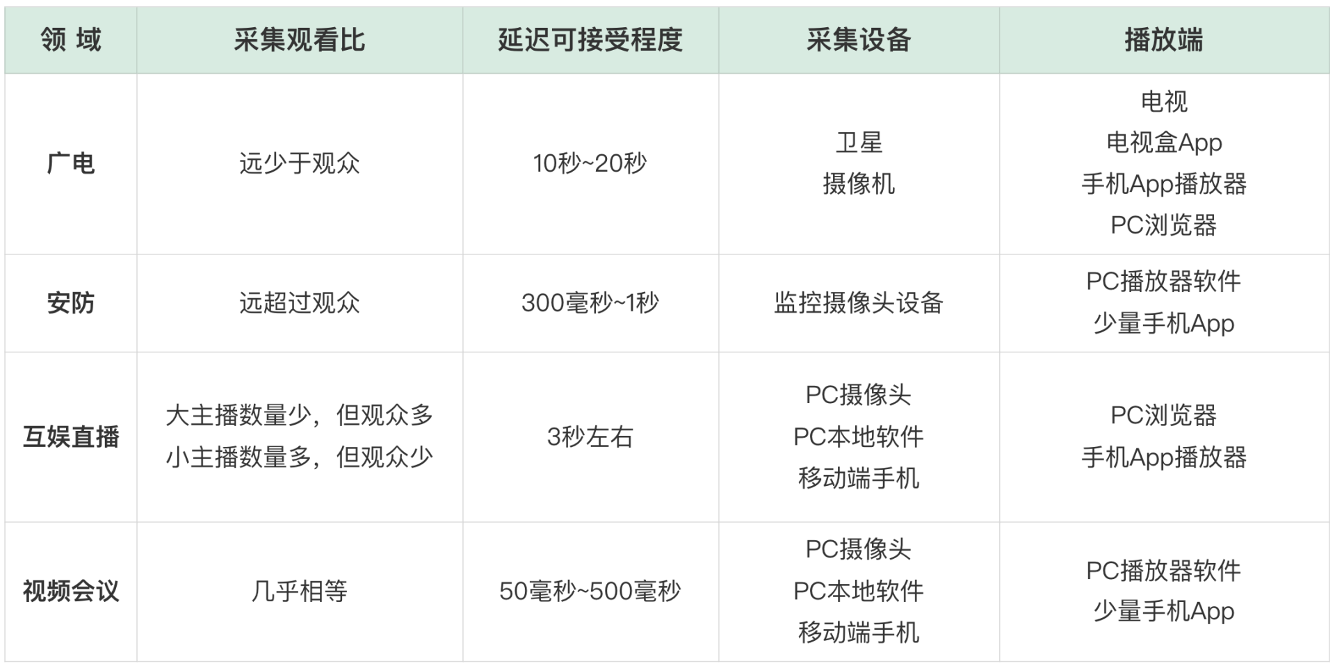 - 安防监控采集直播流,如海康、大华、水滴摄像头等,常用H.323/SIP+RTP等延迟50ms~500ms左右的协议;