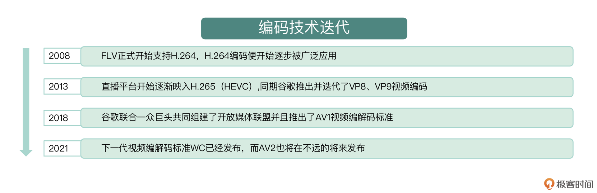 发展过程中有关技术部分的迭代包含了5个维度:音视频编码的迭代、音视频传输协议的迭代、音视频封装的迭代、音视频传输质量优化策略的迭代以及平台功能的迭代。接下来我们就从这五个维度出发系统地阐述直播技术的发展和演进过程。