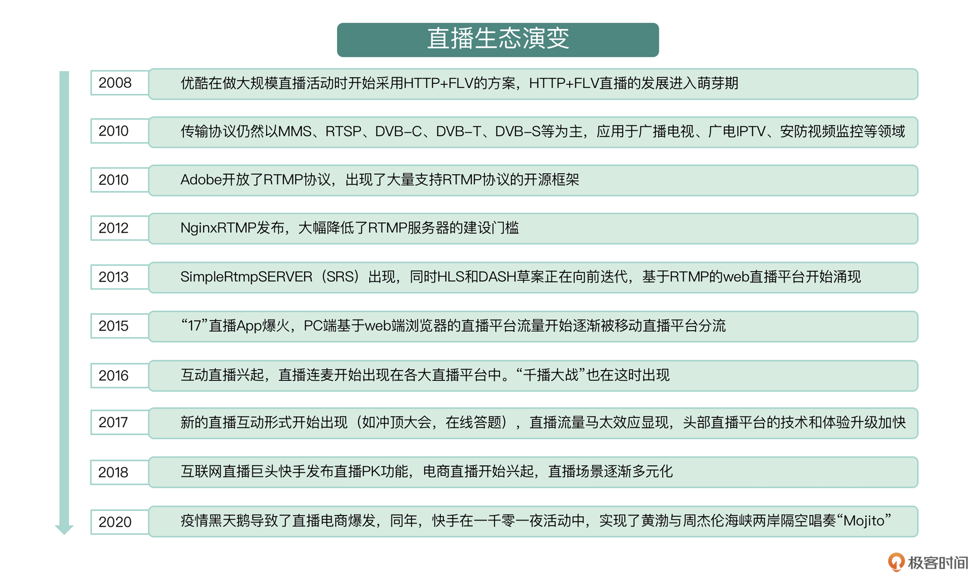 那么除了fragment mp4之外,我们还有哪些格式和协议可以做直播?这节课我们来了解一下直播在过去这十年之间发展的经过以及基本信息,以便我们对自己即将进入的直播场景有一个基本的了解。