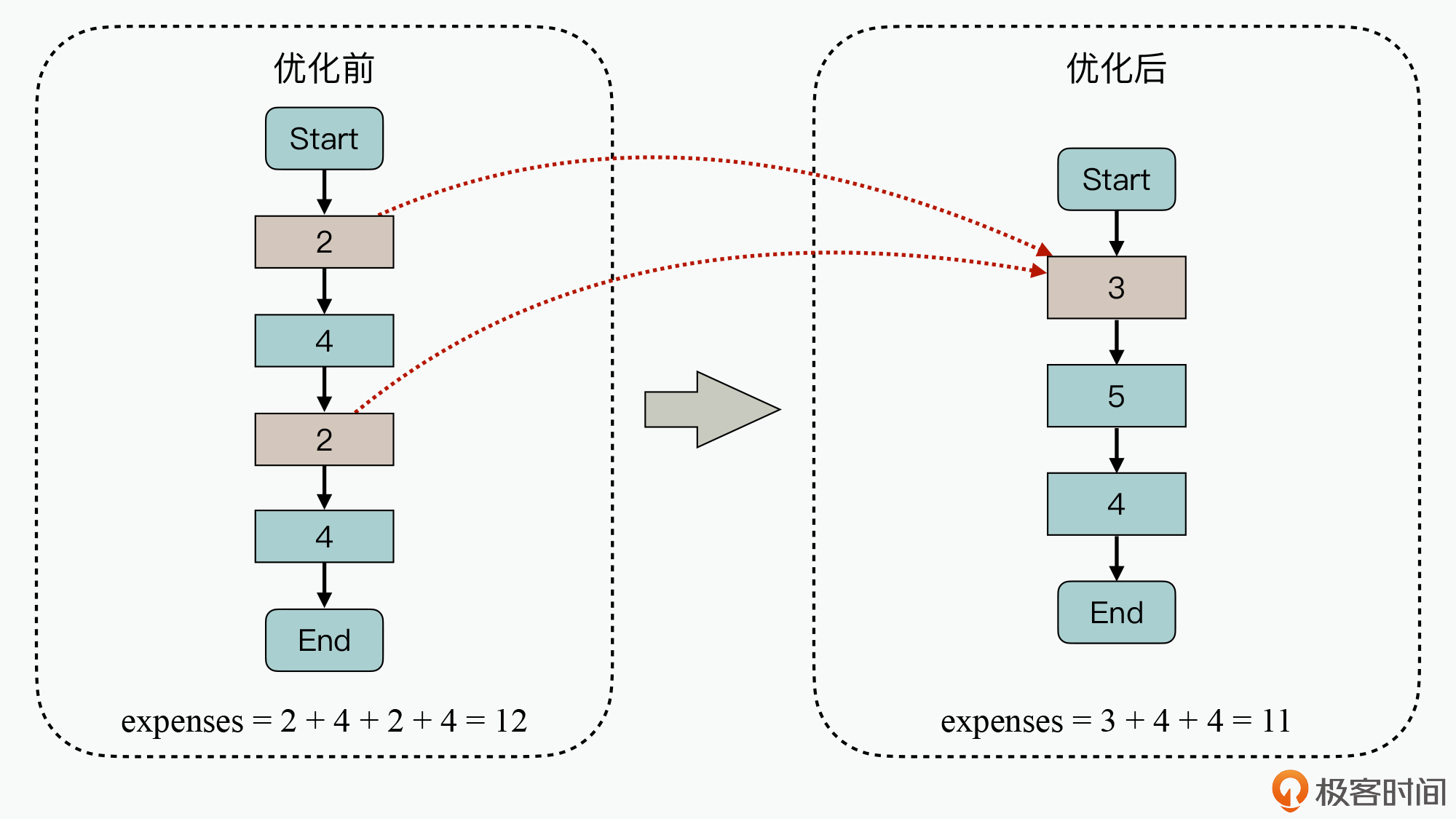 可以看到,图中左侧粉色的两个代码块是相对独立的,执行开销分别为2,在优化过程中将两个代码块逻辑合并到一起后,执行总开销变为了3。这样在使用这种方式优化后,系统的总执行开销就从原来的12降低到了11,处理时延也就降低了。