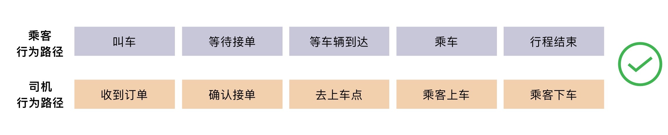 通过这个例子,我们可以看到,在同一个打车的场景里面,司机和乘客这两种角色的目标是完全不一样的。正因为这两种角色的目标不同,即使两个角色同时出现在一个乘车的场景中,但两个角色的行为差异性也是比较大的。