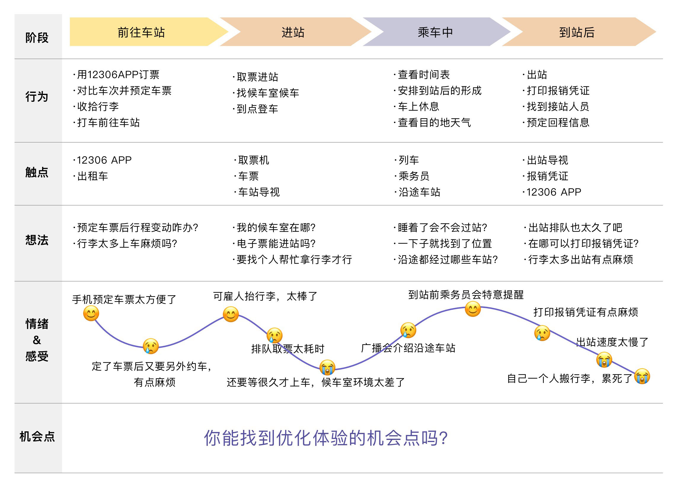 根据这一讲中给出的乘坐高铁的体验地图,你能找到优化体验的切入点吗?与这个切入点对应的优化方案又是什么呢?你可以自己尝试一下。