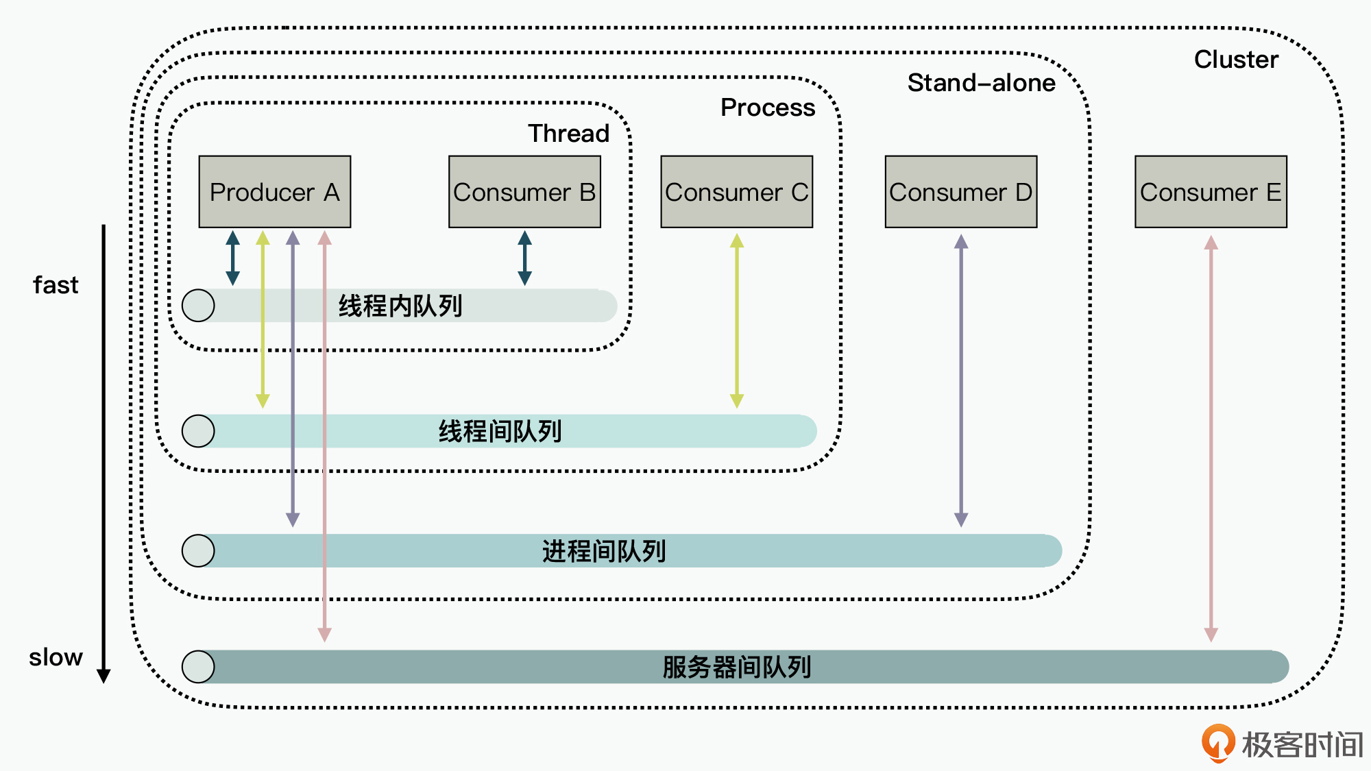 这也就是说,如果我们在线程内通信选择了线程间队列,虽然它也可以满足功能需求,但是由于需要解决同步互斥的问题,其性能往往不会是最佳的。所以,在选型设计阶段,我们要优先选择能够满足通信要求的同时,底层实现也是最快的消息队列类型。