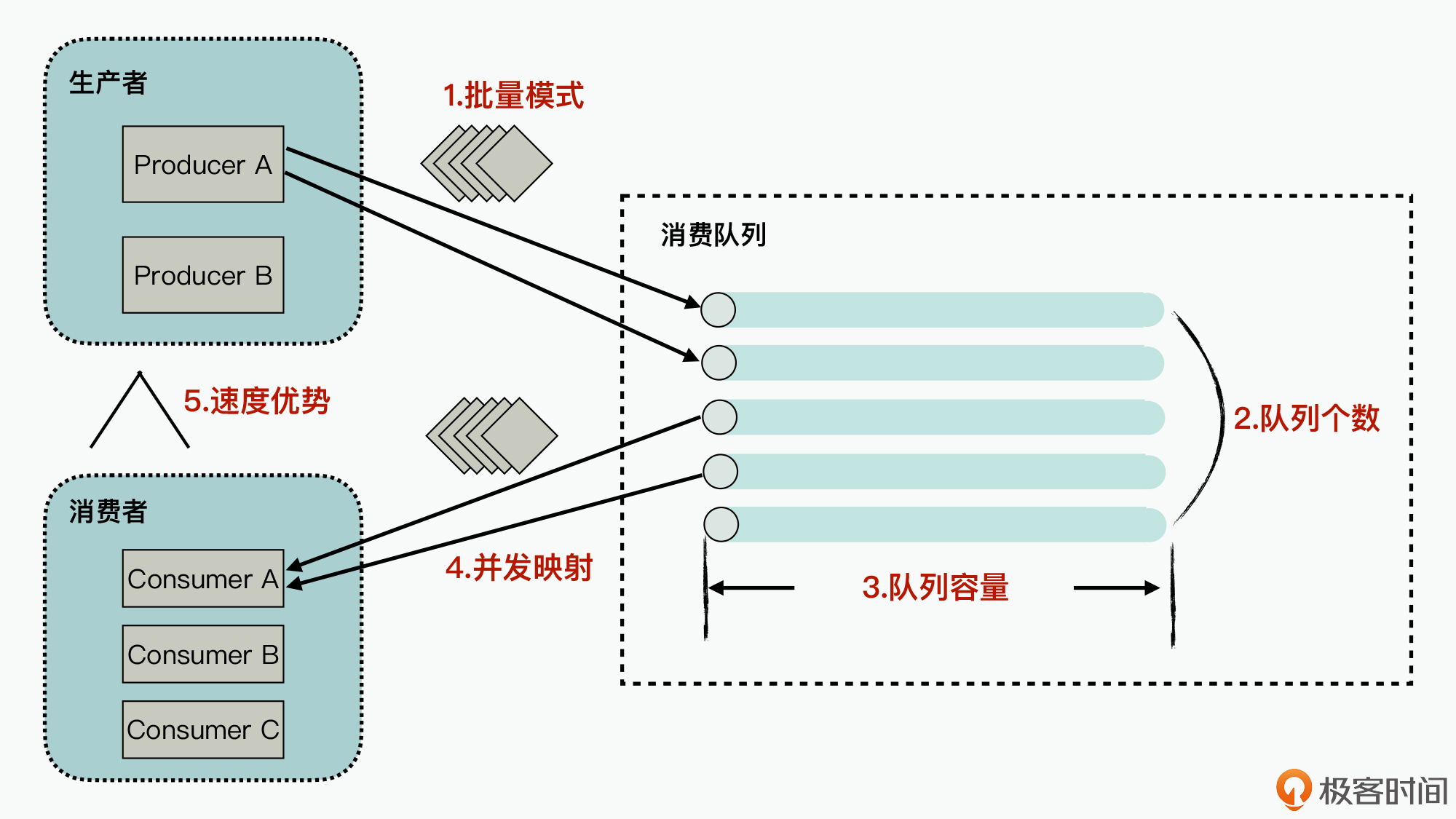 首先是批量模式,通常对于消息队列而言,单个消息与批量消息的读取与写入的性能差异非常大,所以很多消息队列在这里都提供了很灵活的配置能力,比如Kafka客户端的batch大小和最大时延,或者RabbitMQ中接收端的prefetch等配置。也就是说,我们在业务代码中设计消息队列通信之前,一定要针对业务模型,调整和分析批处理模式中的相关配置。