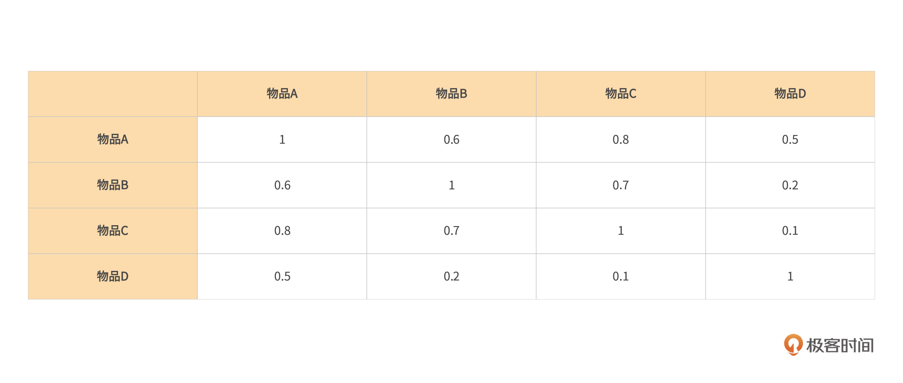 用户A买了物品A和C,用户B买了物品A和B,我们假设物品A和物品C的相似度很高,那么这个时候,就会把物品C推荐给用户B。这个推荐实际上就是利用了基于Item的协同过滤,再把这四个物品转换成一个表格来表示相似度,就会看到下面这样一个表格。