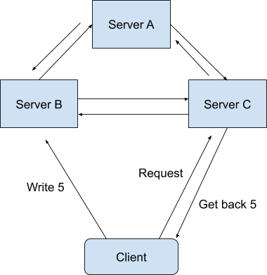 一致性在这里指的是线性一致性(Linearizability Consistency)。在线性一致性的保证下,所有分布式环境下的操作都像是在单机上完成的一样,也就是说图中Sever A、B、C的状态一直是一致的。
