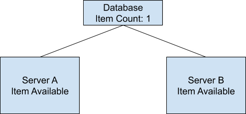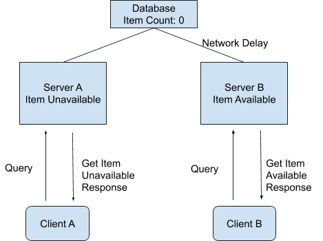 假设我们设计了一个分布式的购物系统,在这个系统中,商品的存货状态分别保存在服务器A和服务器B中。我们把存货状态定义为“有货状态”或者“无货状态”。在最开始的时候,服务器A和服务器B都会显示商品为有货状态。