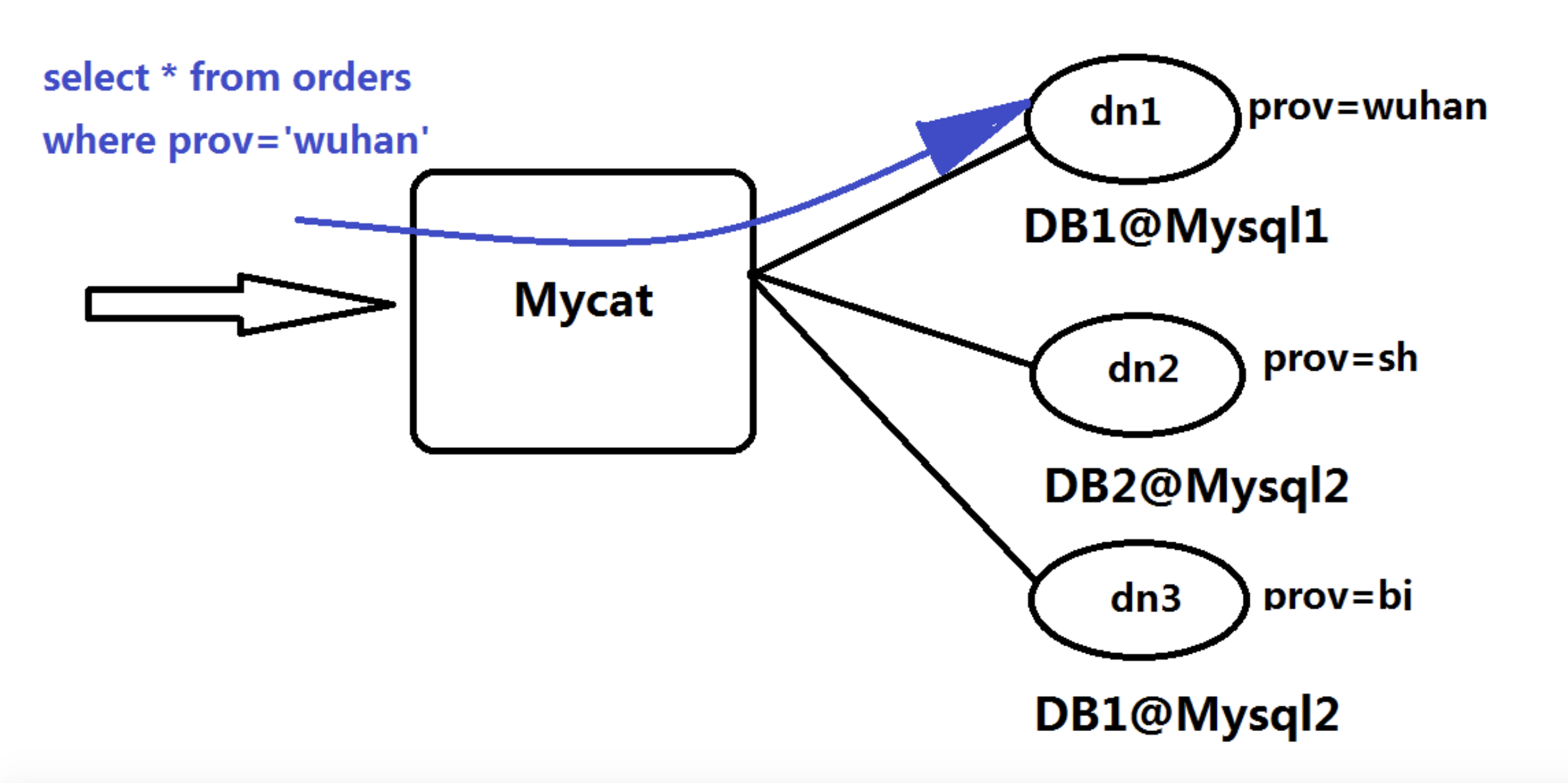应用程序像使用MySQL数据库一样连接MYCAT,提交SQL命令。MYCAT在收到SQL命令以后,查找配置的分片逻辑规则。比如上图例子中,根据地区进行数据分片,不同地区的订单存储在不同的数据库上,那么MYCAT就可以解析出SQL中的地区字段prov,根据这个字段连接相对应的数据库。例子中SQL的地区字段是“wuhan”,而在MYCAT中配置“wuhan”对应的数据库是DB1,用户提交的这条SQL最终会被发送给DB1数据库进行处理。