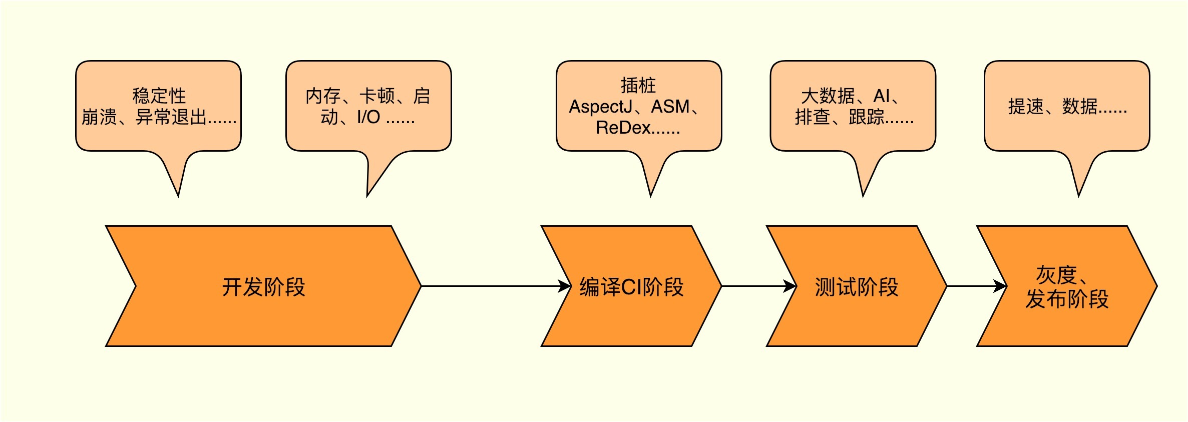 - 编译、CI阶段。编译CI阶段解决的是如何发现和优化开发阶段的一些编码问题,以及快速构建出最终产物。Google的Gradle、Facebook的Buck为编译速度做了哪些努力?Flutter的Hot Reload为什么可以这么快?AspectJ、ASM、ReDex这三种插桩方法的原理和差别是什么?腾讯的RDM、阿里的摩天轮这些编译构建平台有什么特别之处?