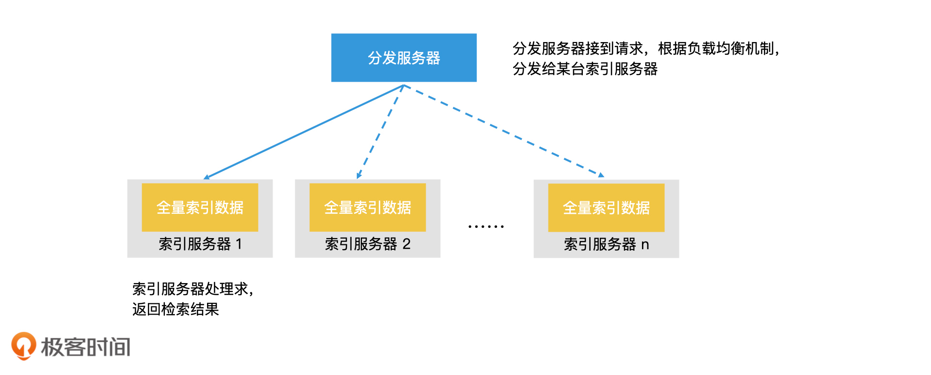 首先,我们需要一台接收请求的服务器,但是该服务器并不执行具体的查询工作,它只负责任务分发,我们把它叫作分发服务器。真正执行检索任务的是多台索引服务器,每台索引服务器上都保存着完整的倒排索引,它们都能完成检索的工作。