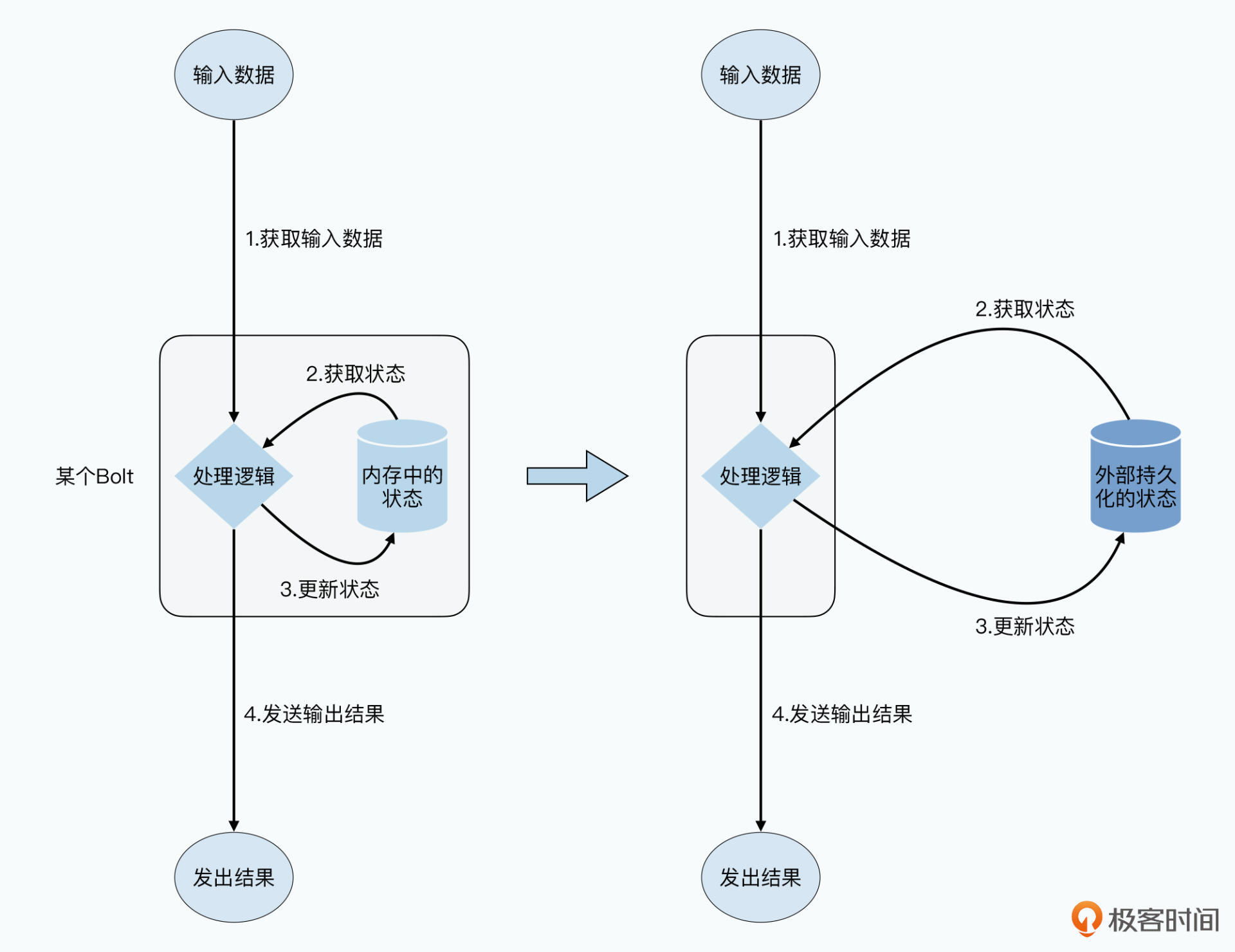 Bolt会被拆分和迁移,并且在迁移的过程中,我们需要能够保留状态信息,这意味着我们的状态需要能够持久化下来。我们需要能够把这些状态,也更新到一个稳定的外部存储中去。当我们的节点挂掉,在其他服务器上恢复计算能力的时候,需要把这些状态信息重新读取回来。