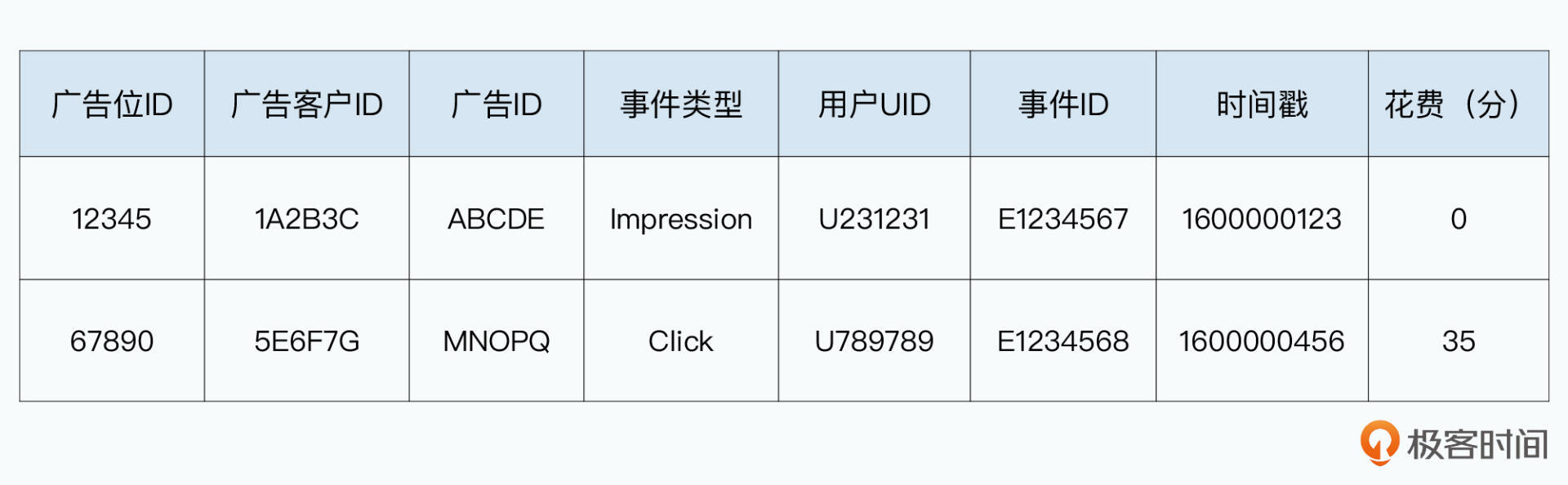 - 最后的时间戳字段,用来记录事件发生的时间。花费字段,则是记录这一次点击广告,需要花费广告客户多少预算。