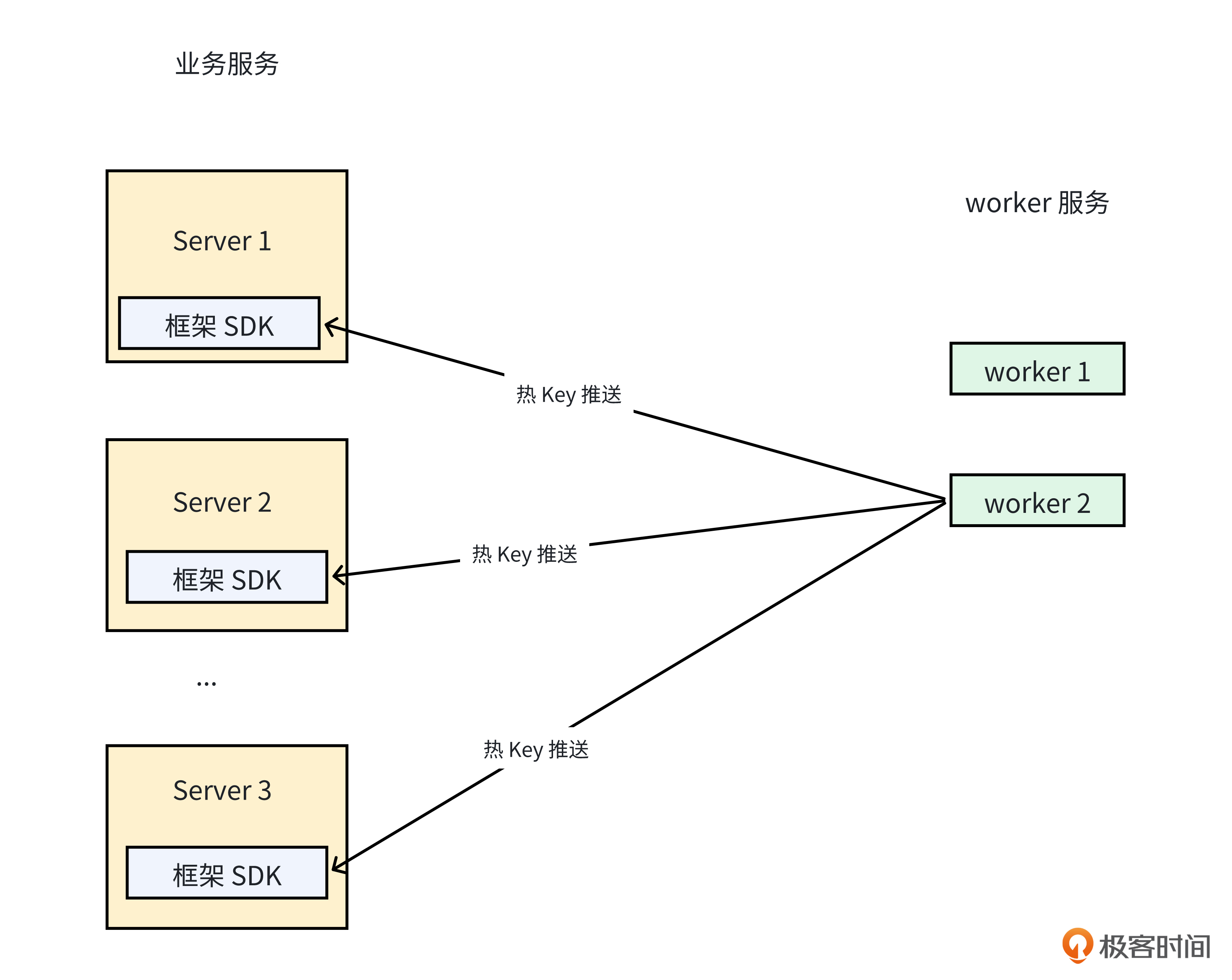 第二步就是热 Key 的判断与推送。当专门负责统计的 worker 服务监测到热 Key 出现时,它会主动地将热 Key 信息推送到所有相关的业务服务实例,从而确保各个业务服务实例能够及时知晓热 Key 的情况,并据此做出相应的处理策略调整。这个过程的示意图如下。