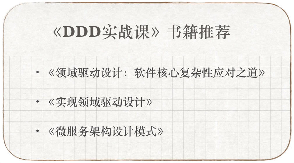 下面是我推荐的几本书,这些内容是可以和本专栏互补的,如果你有意愿进一步学习DDD,它们是非常好的学习资料。