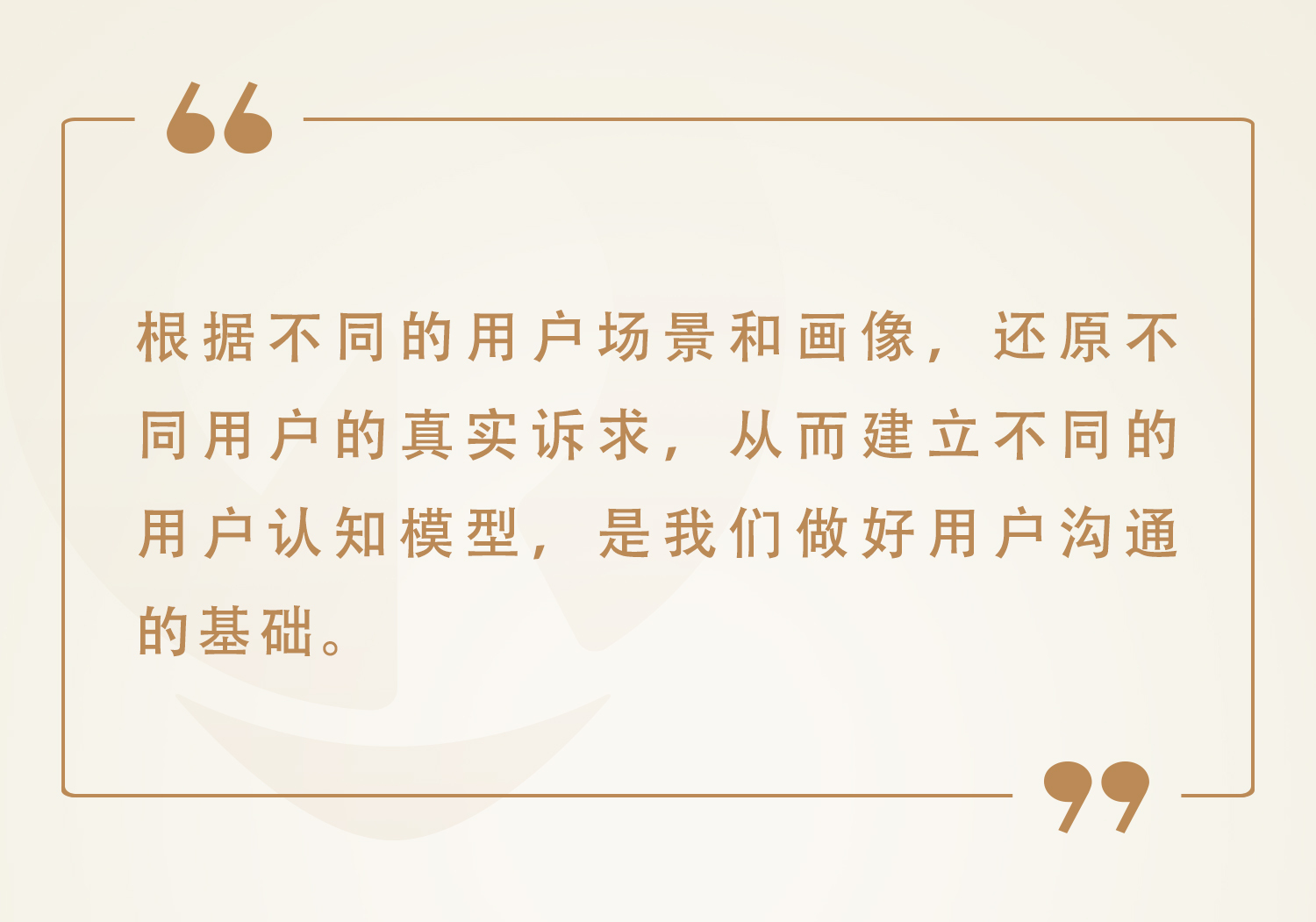 所以说,根据不同的用户场景和画像,还原不同用户的真实诉求,从而建立不同的用户认知模型,是我们做好用户沟通的基础。