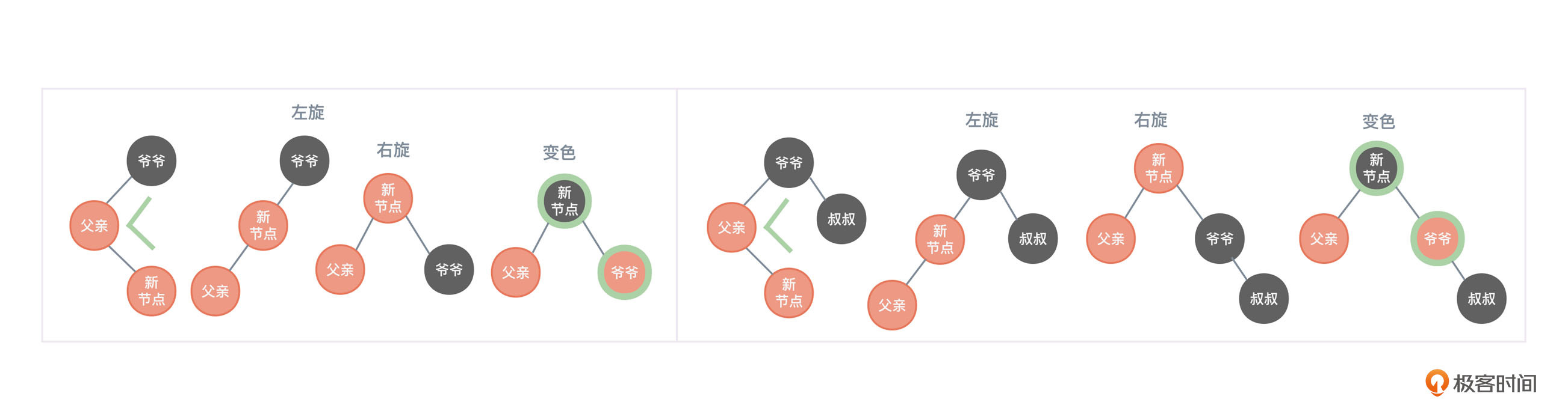 本节课我带你学习了红黑树插入节点操作的各种情况以及插入操作后平衡性调整的方法。