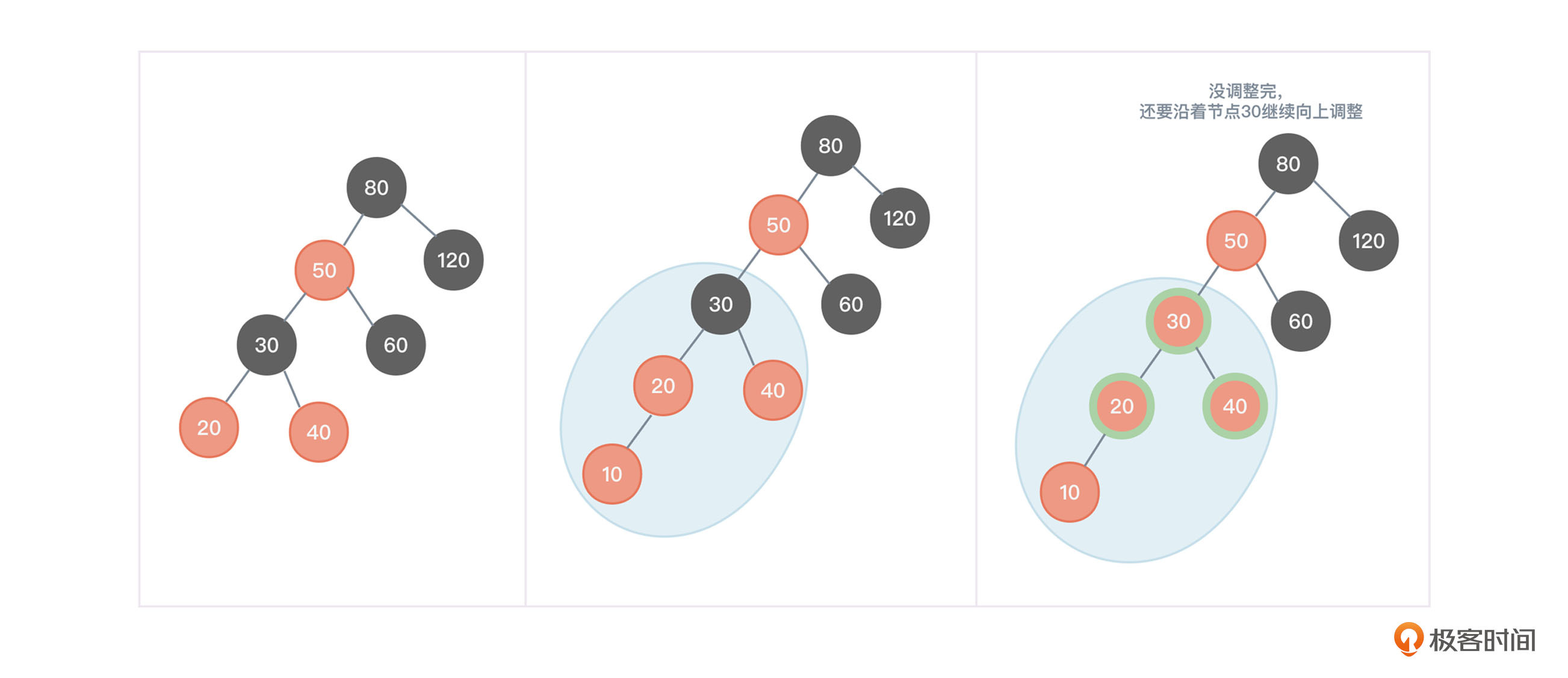 - 以节点50为根,向右旋转,将30作为50的父节点。向右旋转你应该不陌生,前面讲平衡二叉树时已经详细讲解过;