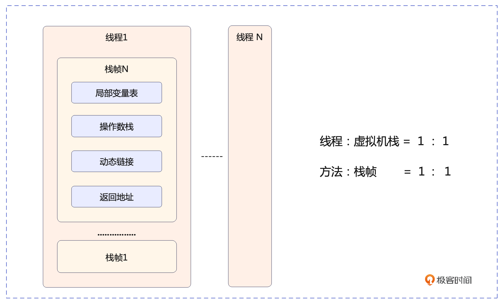 每个线程都有自己独立的栈空间。在触发方法的时候会创建一个栈帧结构,这个结构将保存所有与方法关联的信息,包括但不限于局部变量、操作数栈、动态链接以及返回地址。然而栈帧的深度是有限制的,一旦超过这个界限,就会出现 StackOverflowError 异常。每个方法从开始被调用都会有一个栈帧的压栈和出栈操作,这个过程可以一直追溯到VM栈的初始状态。