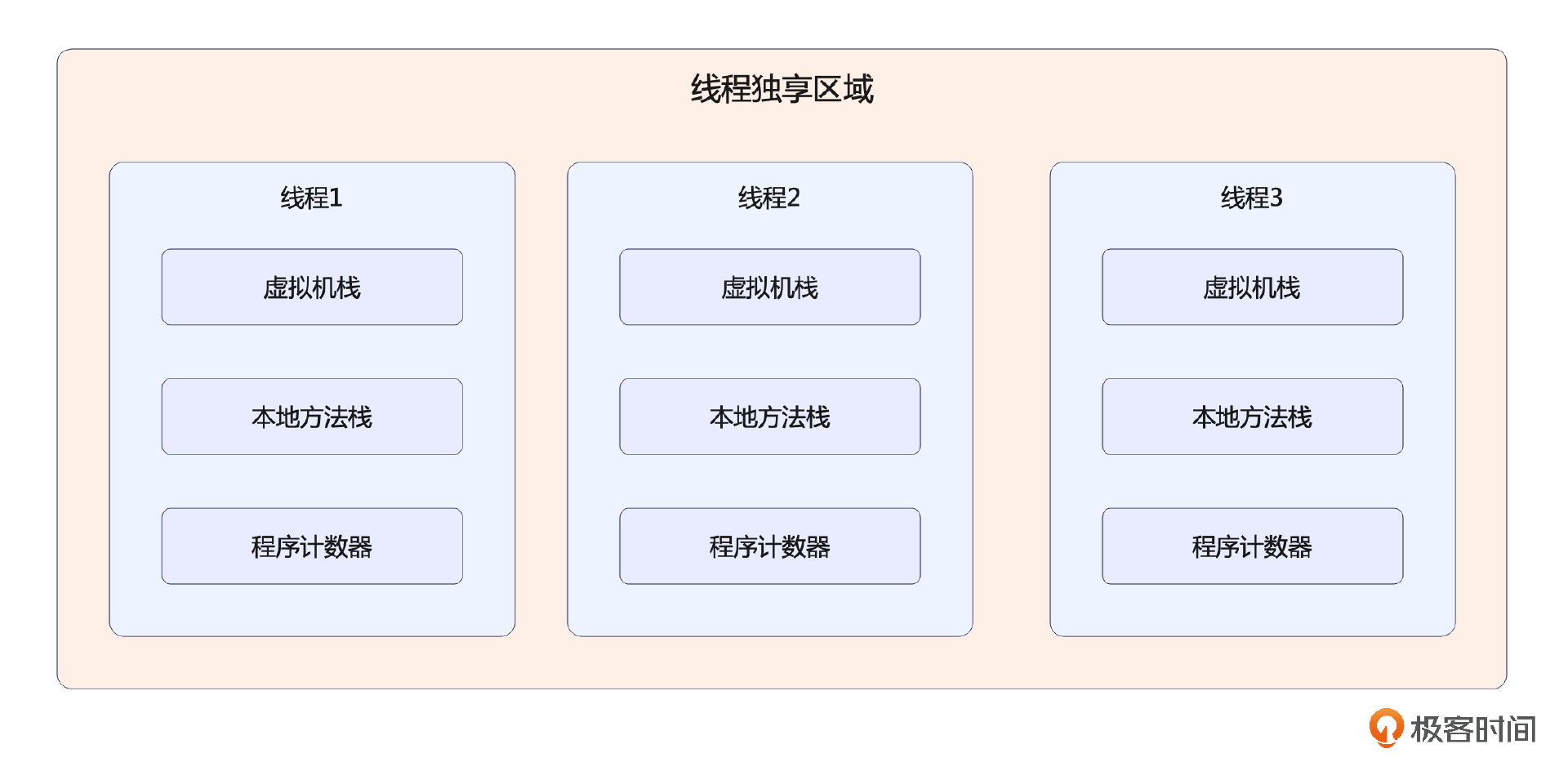 线程共享区域包括堆和方法区,方法区用于存储类的结构信息,堆用于存储对象实例等。这节课我们将聚焦在线程独享区域,方法区和堆的介绍我将在类加载器和GC的部分为你详细介绍。