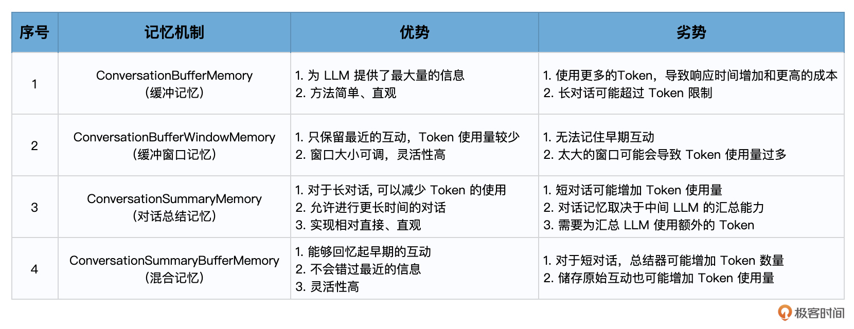 好的,今天我给你介绍了一种对话链和四种类型的对话记忆机制,那么我们可以通过一个表格对这四种类型的记忆做一个整体比较。