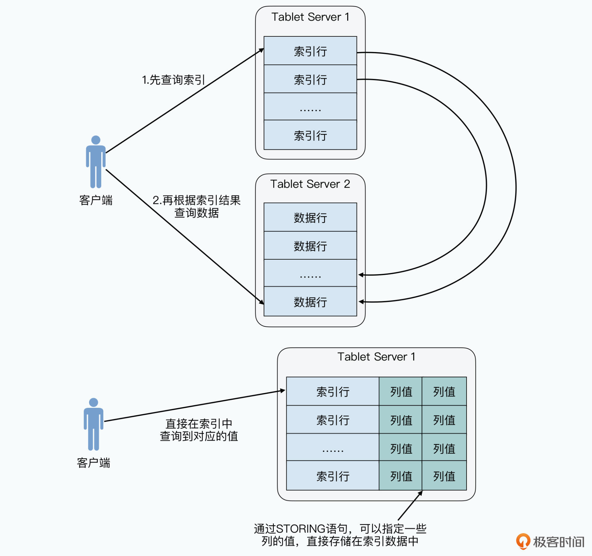 而在Megastore里,你可以通过一个STORING语句,指定索引里存储下对应的数据记录的某一个字段的值。这样,我们的查询只需要检索索引,就能拿到需要字段的值。