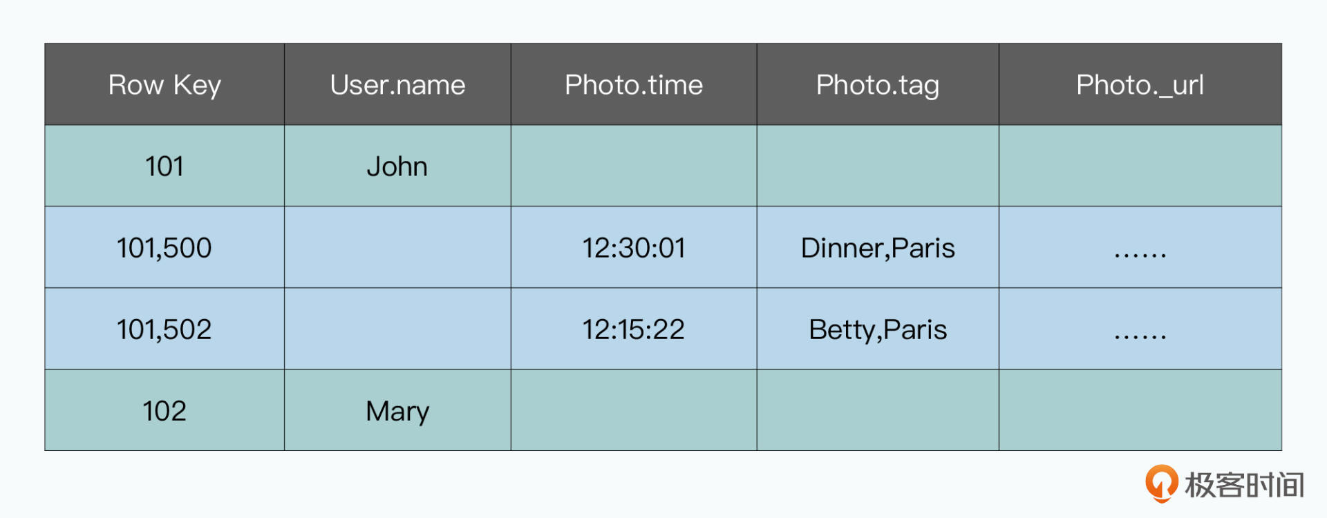 我把论文里面的图5,也就是前面的PhotoApp表在Bigtable里是怎么存储的放在了这里,并把示例数据分别标成了绿色和蓝色。对于PhotoApp里的User和Photo这两张表,是存放在同一张Bigtable的表里的,其中,绿色部分的数据是来自User表的,而蓝色部分的数据来自Photo表。