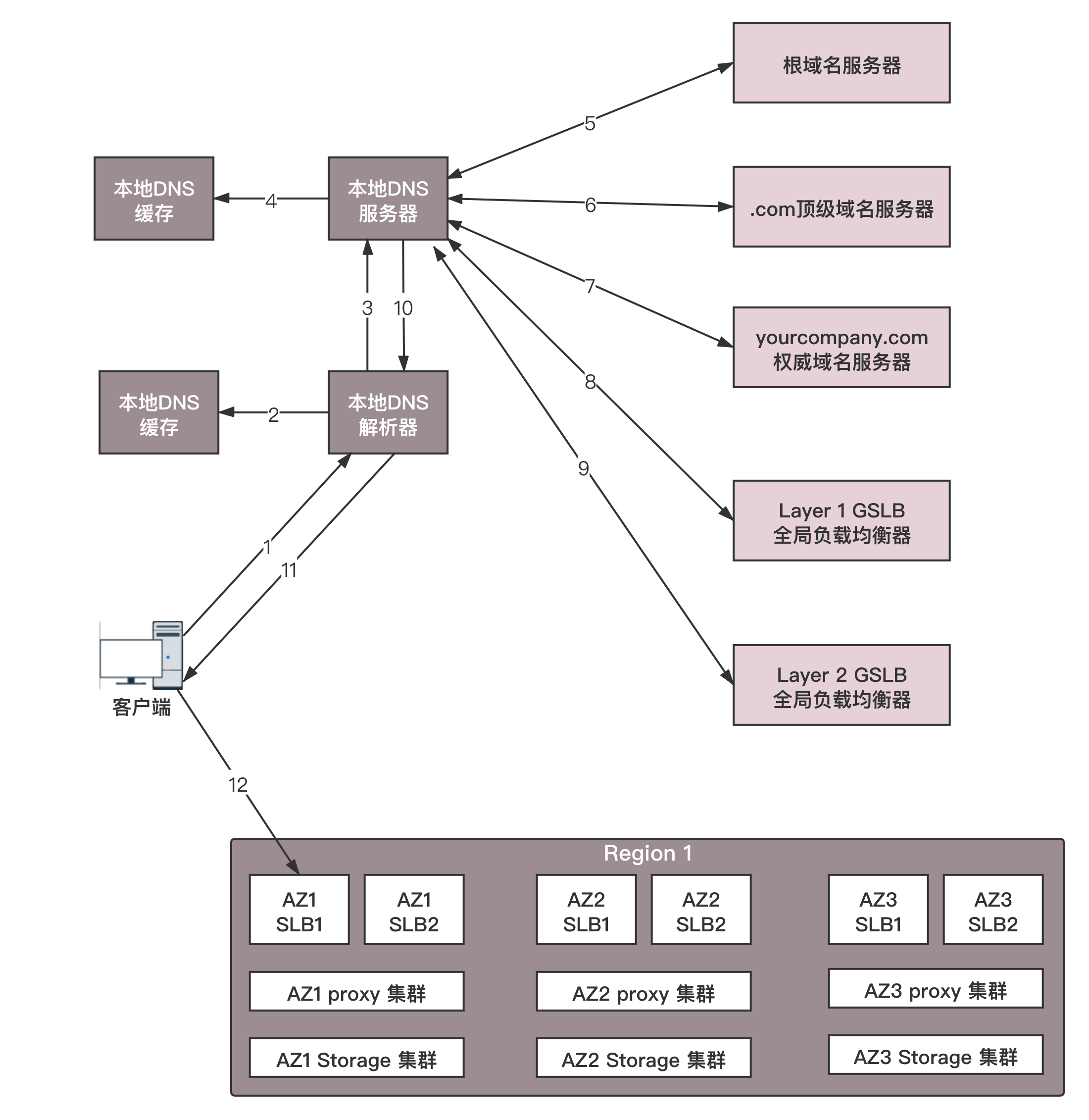 我们通过DNS访问数据中心中对象存储上的静态资源为例,看一看整个过程。