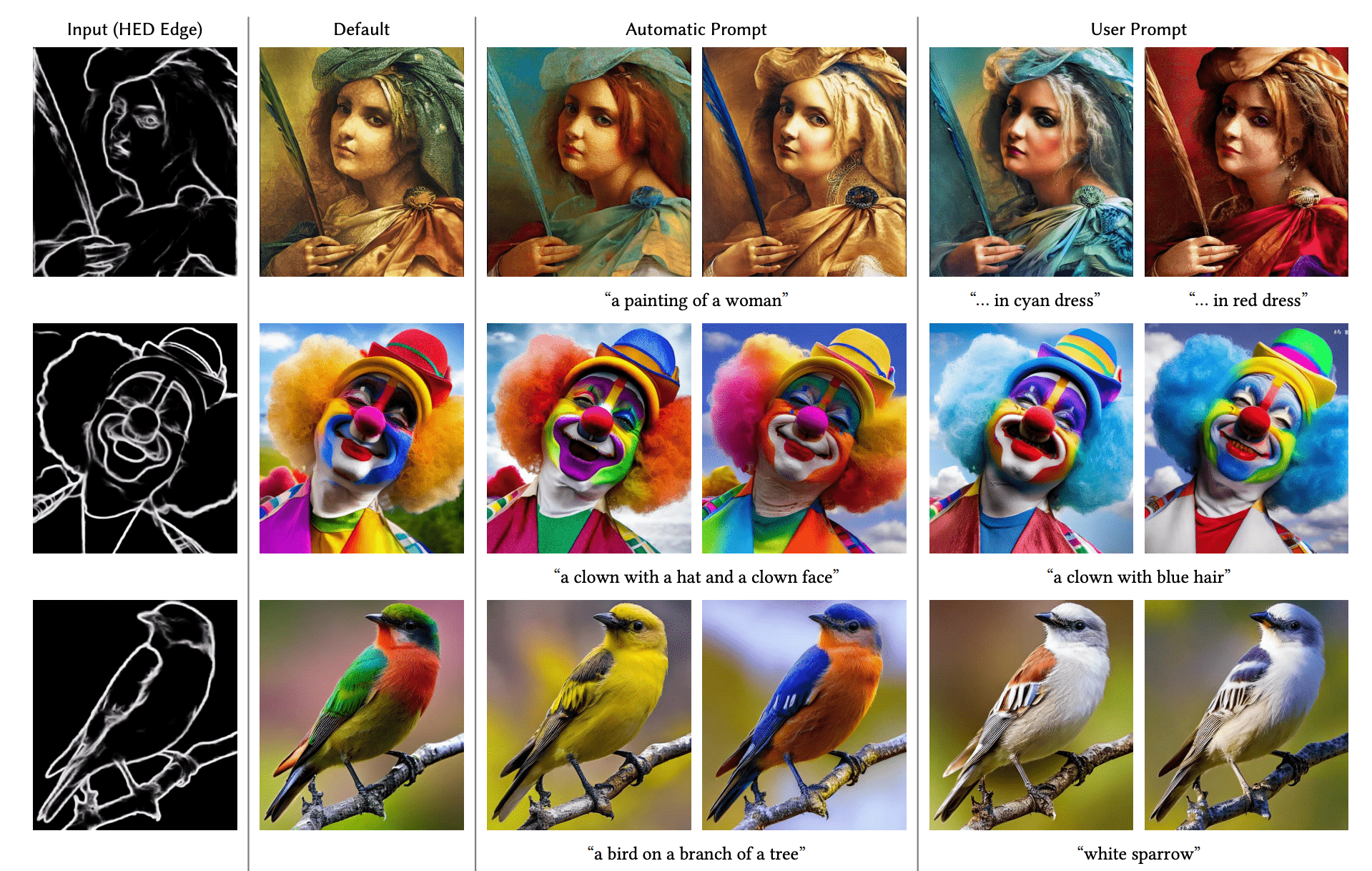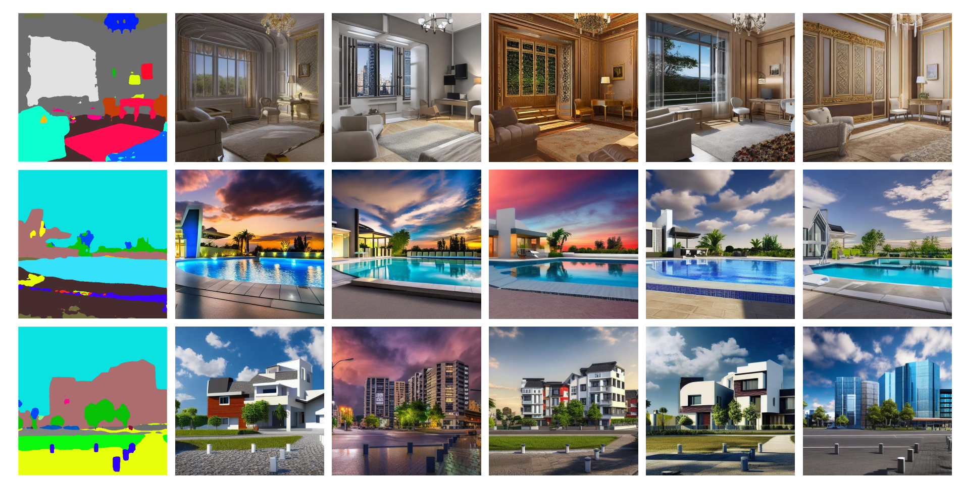 事实上,ControlNet可用的控制条件还远不止这些。比如后面这些图,展示的就是使用HED边缘、人体姿态点、图像分割结果作为控制条件,配合上各种不同prompt生成的图像效果。