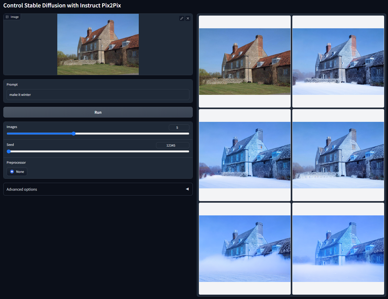 首先是指令级修图的ControlNet。比如后面这张风景图片,我们希望转换图片里的季节,就可以通过prompt写下“make it winter”。图中的五个冬季效果是使用不同随机种子得到的。