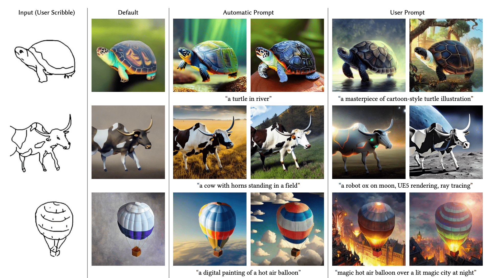 再比如,我们随手画一个草图,比如简单几笔勾勒出乌龟、奶牛和热气球,同样是配合上我们随手写出的prompt,便可以生成精美的图片。