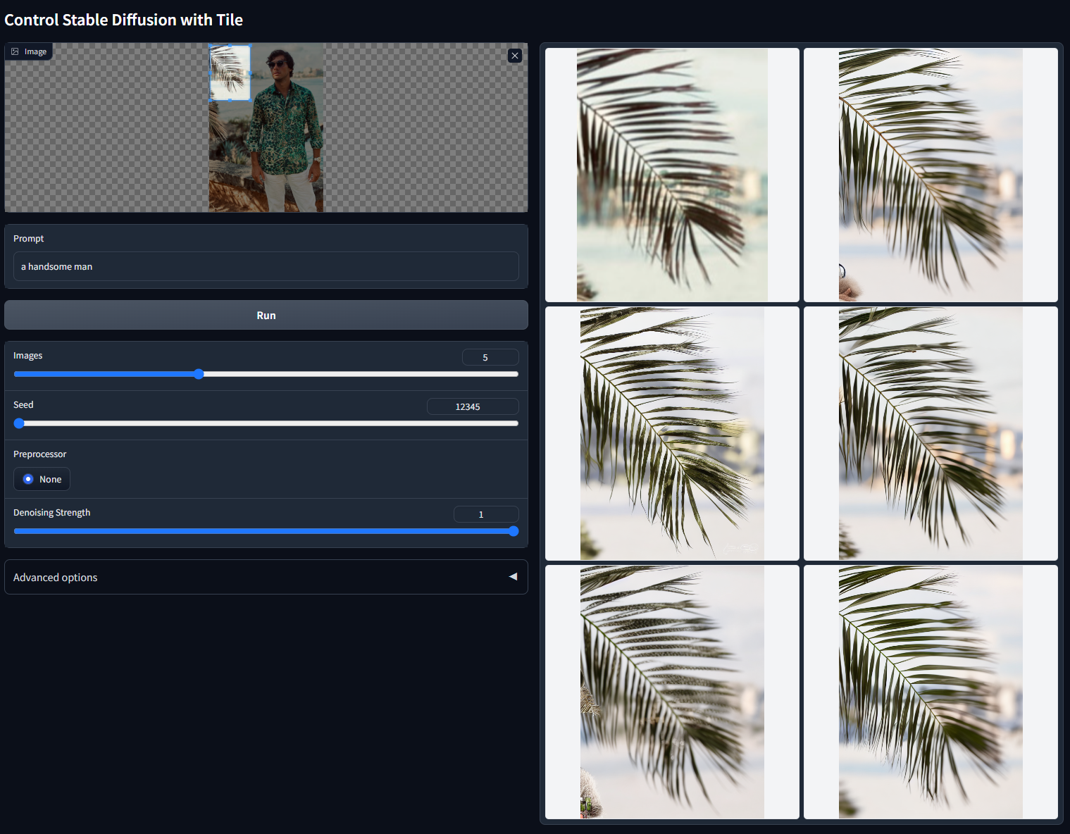 Tile功能对于生成超高分辨率的图片(比如4K图像)非常有用,比如后面这张图片,我们的prompt是“a handsome man”,希望AI绘画模型帮我们补充各种局部细节。如果是使用传统SD模型切块生成再合并,每个切块内都会有一个帅哥,拼接起来的画面自然很鬼畜。